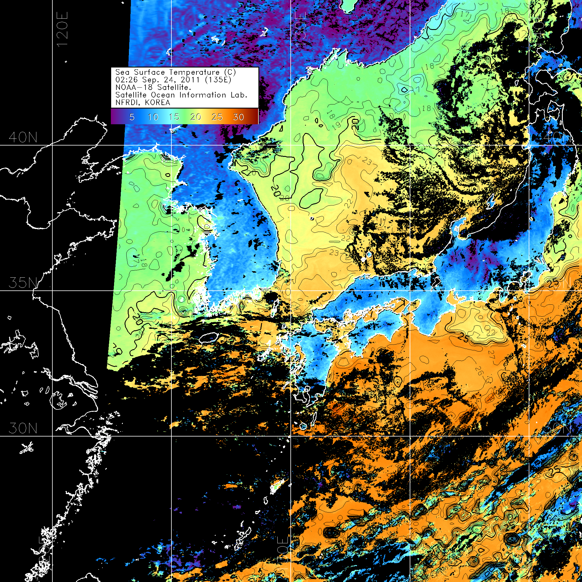 o 2011년 09월 24일 02시 26분 NOAA-18호 위성영상입니다. o 수온분포는 범례를 참고하시기 바랍니다. o 검은색은 구름을 나타냅니다. o 그림을 클릭하시면 크게 보실 수 있습니다.