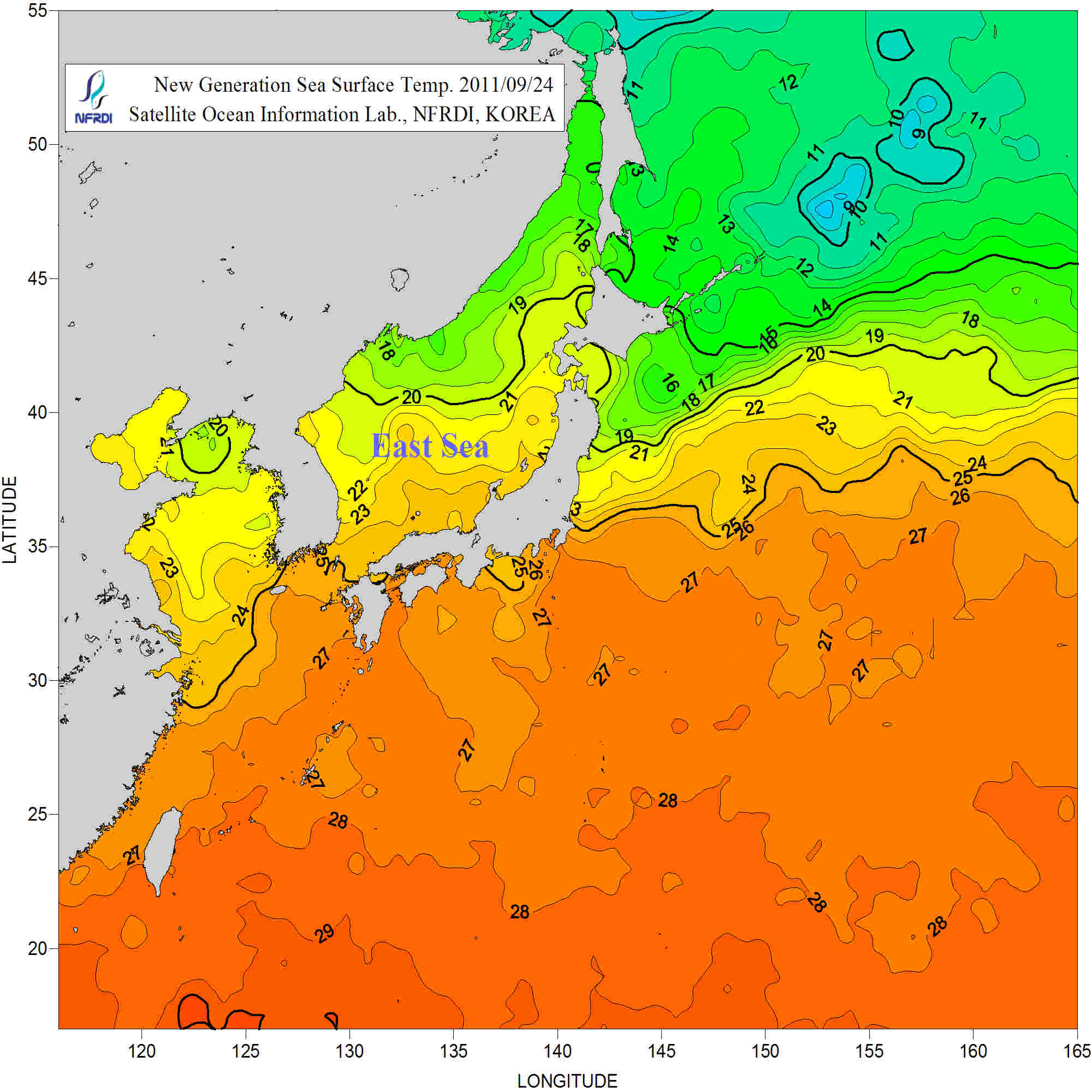 o 2011년 09월 24일 북서태평양 광역해양 수온분포 입니다. o 아래 위성 수온분포도는 국립수산과학원(NFRDI, Korea)과 일본동북대학교 (Tohoku University, Japan)가 공동연구개발 진행중, 1차 연구결과인 것으로 구름의 영향을 배제한 신기술의 수온정보입니다.