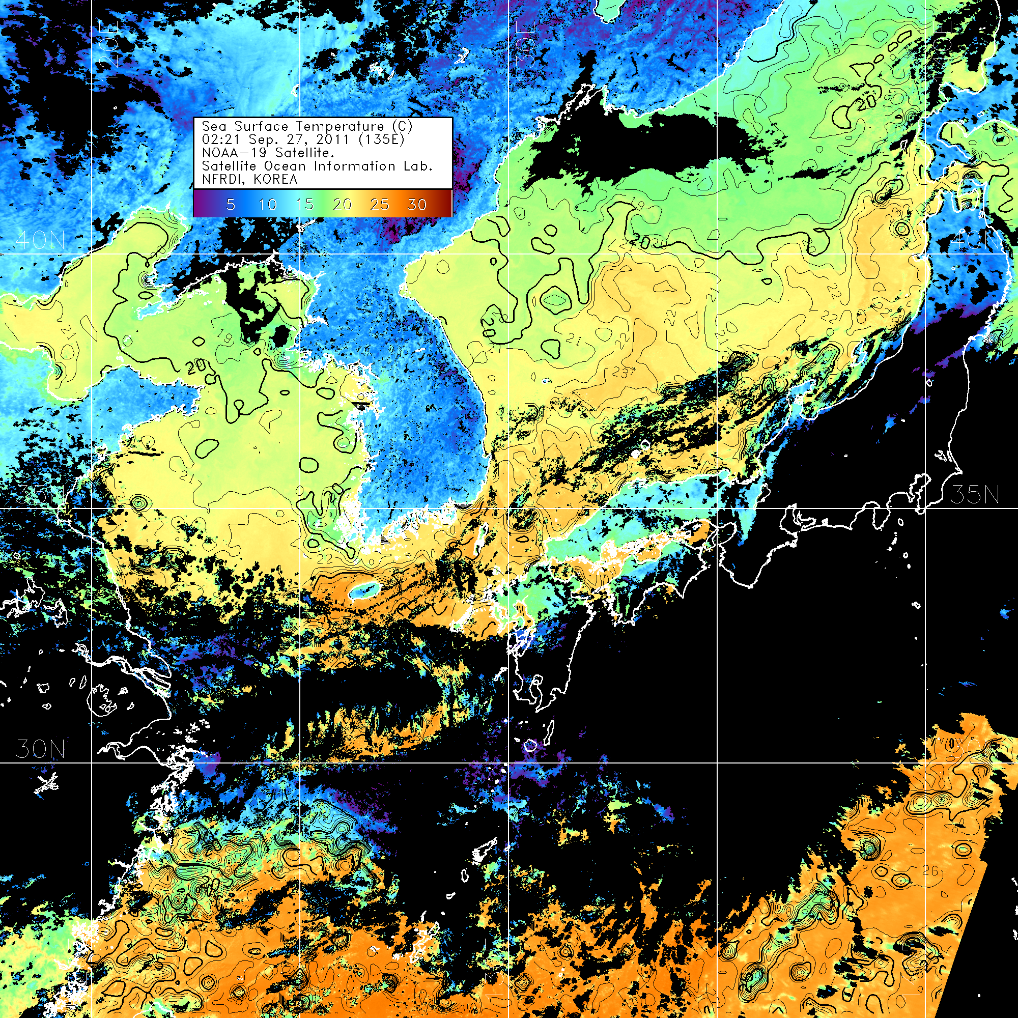o 2011년 09월 27일 02시 21분 NOAA-19호 위성영상입니다. o 수온분포는 범례를 참고하시기 바랍니다. o 검은색은 구름을 나타냅니다. o 그림을 클릭하시면 크게 보실 수 있습니다.
