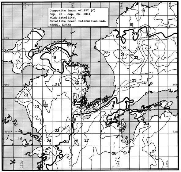 o 금주(2011.09.20~2011.09.26)의 한국근해 표면수온은 대화퇴 근해 21~22도, 울릉도 근해 22~23도, 대마도 근해 25~27도, 제주도 근해 25~27도, 이어도 근해 24~26도, 가거초 근해 22~23도, 어청도 근해 21~22도로 나타납니다. o「평년에 비해」대화퇴 근해 비슷하게, 울릉도 근해 비슷하게, 대마도 근해 0.9도 높게, 제주도 근해 1.1도 높게, 이어도 근해 비슷하게, 가거초 근해 0.7도 낮게, 어청도 근해는 비슷하게 나타납니다. o「전년에 비해」대화퇴 근해 3도 낮게, 울릉도 근해 0.5도 낮게, 대마도 근해 1도 낮게, 제주도 근해 1.5도 높게, 이어도 근해 2.5도 낮게, 가거초 근해 2.5도 낮게, 어청도 근해는 2도 낮게 나타납니다. o 수온 전선대는 우리나라 제주해협에서 대한해협까지 24도를 중심으로 형성됩니다.