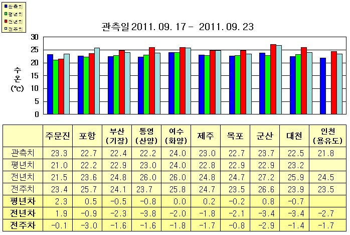 o 금주(2011.09.17~2011.09.23)의 한반도 연안 표면수온은 동해 연안역에서 섭씨 22.0~23.5도, 남해 연안역 22~24도, 서해 연안역에서 21.5~24.0도로 나타납니다. o 평년에 비해 부산(기장) 0.5도 낮음을 제외한 동해 연안역은 0.5~2.5도 높게, 통영(산양) 0.8도 낮음을 제외한 남해 연안역은 비슷하게, 군산 0.8도 높음을 제외한 서해 연안역은 0.5~1.0도 낮게 나타납니다. o 전년에 비해 주문진 1.9도 높음을 제외한 동해 연안역은 0.5~2.5도 낮게, 남해 연안역은 1.5~4.0도 낮게, 서해 연안역은 2.0~3.5도 낮게 나타납니다.