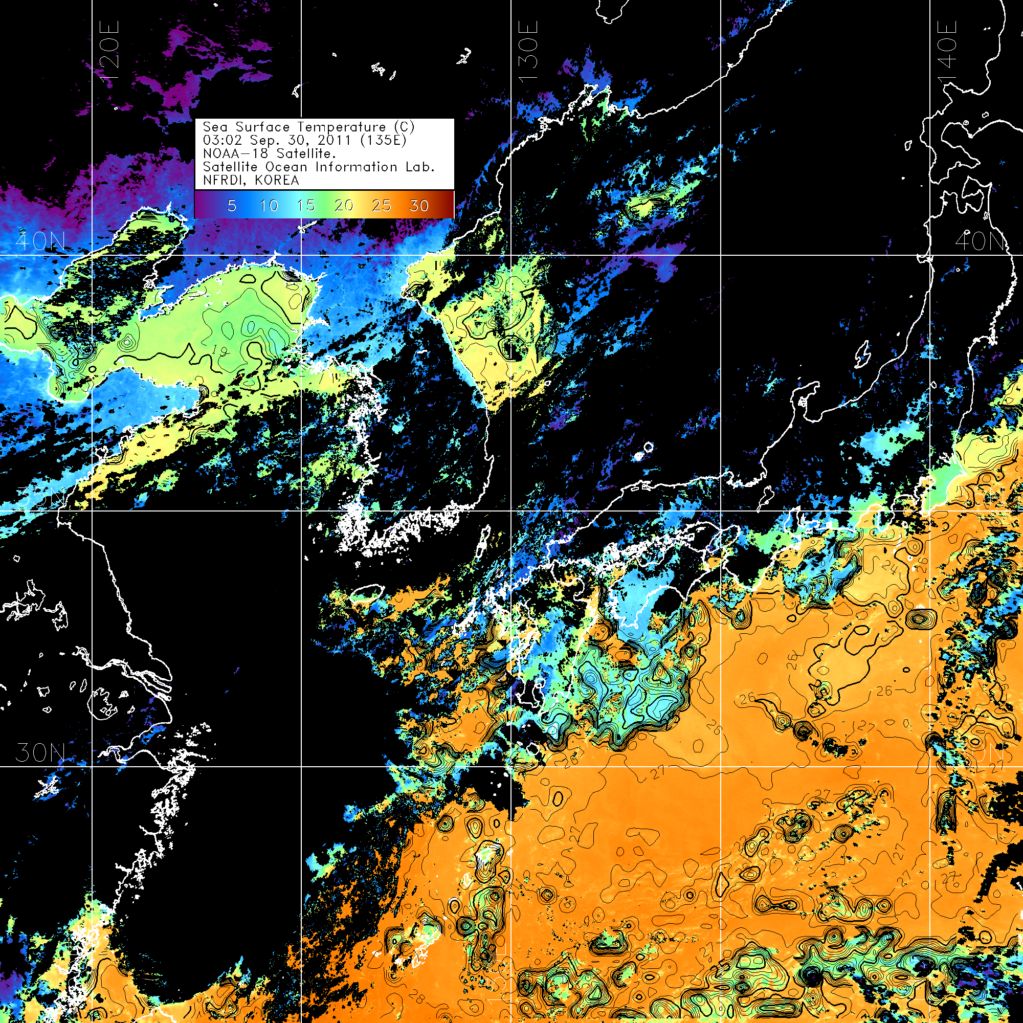 o 2011년 09월 30일 03시 02분 NOAA-18호 위성영상입니다. o 수온분포는 범례를 참고하시기 바랍니다. o 검은색은 구름을 나타냅니다. o 그림을 클릭하시면 크게 보실 수 있습니다.