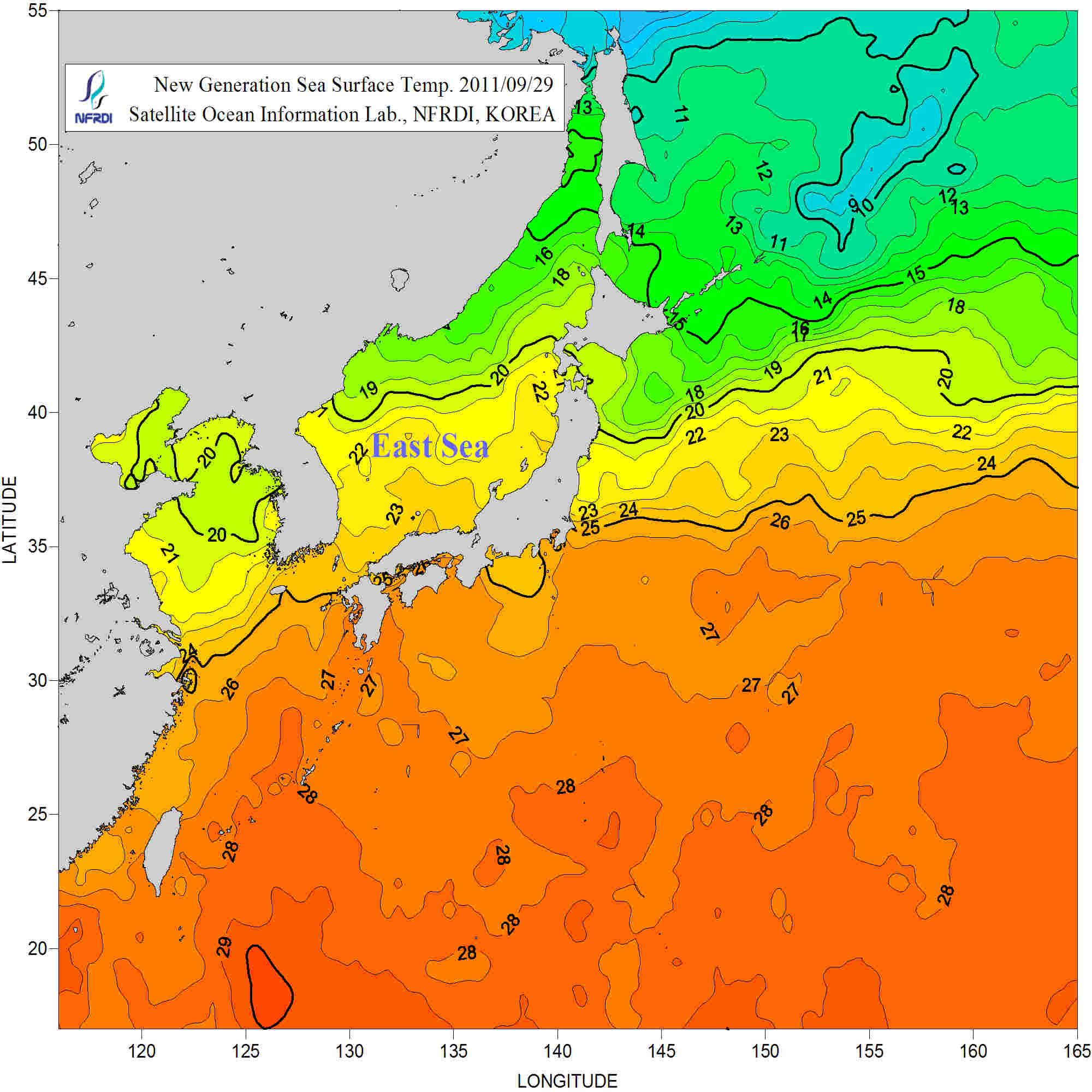o 2011년 09월 29일 북서태평양 광역해양 수온분포 입니다. o 아래 위성 수온분포도는 국립수산과학원(NFRDI, Korea)과 일본동북대학교 (Tohoku University, Japan)가 공동연구개발 진행중, 1차 연구결과인 것으로 구름의 영향을 배제한 신기술의 수온정보입니다.