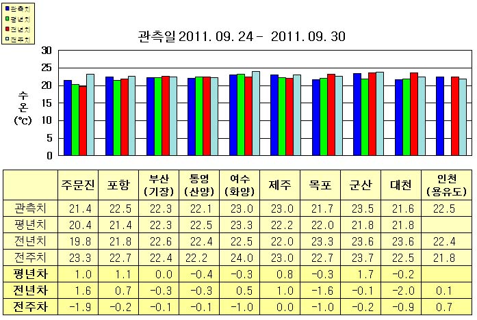 o 금주(2011.09.24~2011.09.30)의 한반도 연안 표면수온은 동해 연안역에서 섭씨 21.0~22.5도, 남해 연안역 22~23도, 서해 연안역에서 21.5~23.5도로 나타납니다. o 평년에 비해 부산(기장) 비슷함을 제외한 동해 연안역은 1.0~1.5도 높게, 제주 0.8도 높음을 제외한 남해 연안역은 0.5도 낮게, 군산 1.7도 높음을 제외한 서해 연안역은 비슷하게 나타납니다. o 전년에 비해 부산(기장) 비슷함을 제외한 동해 연안역은 0.5~2.0도 높게, 통영(산양) 비슷함을 제외한 남해 연안역은 0.5~1.0도 높게, 군산, 인천(용유도) 비슷함을 제외한 서해 연안역은 1.5~2.0도 낮게 나타납니다.