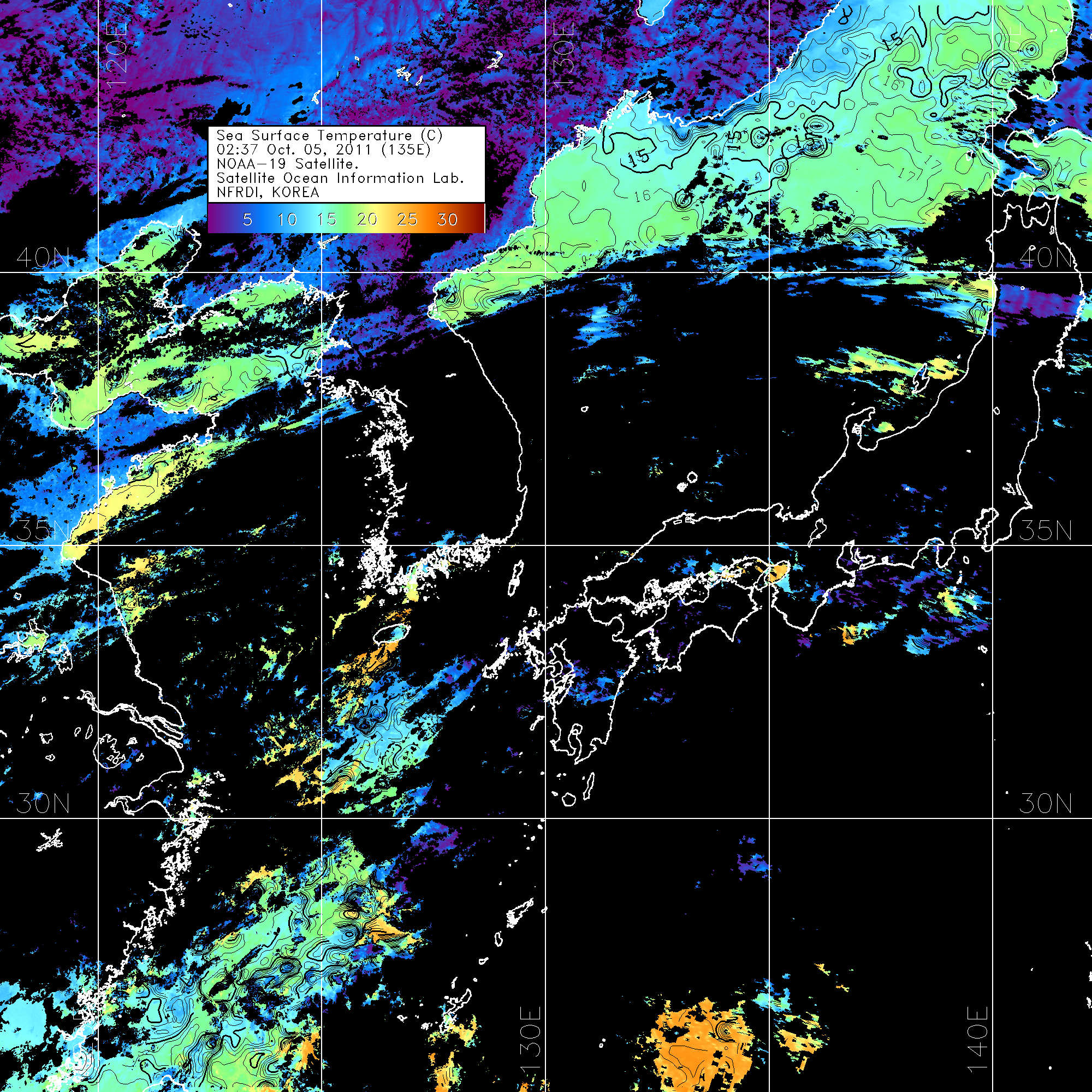 o 2011년 10월 05일 02시 37분 NOAA-19호 위성영상입니다. o 수온분포는 범례를 참고하시기 바랍니다. o 검은색은 구름을 나타냅니다. o 그림을 클릭하시면 크게 보실 수 있습니다.