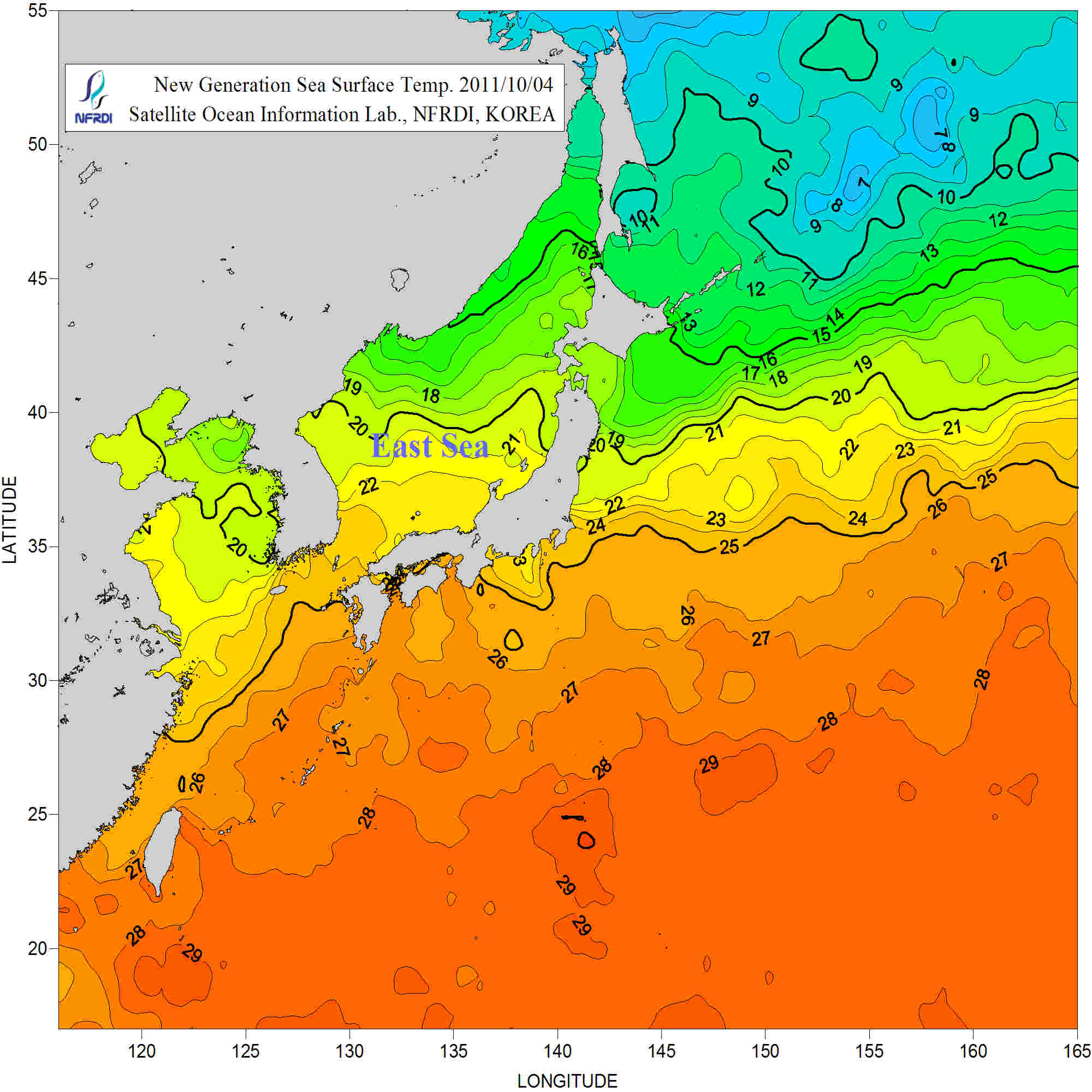 o 2011년 10월 04일 북서태평양 광역해양 수온분포 입니다. o 아래 위성 수온분포도는 국립수산과학원(NFRDI, Korea)과 일본동북대학교 (Tohoku University, Japan)가 공동연구개발 진행중, 1차 연구결과인 것으로 구름의 영향을 배제한 신기술의 수온정보입니다.