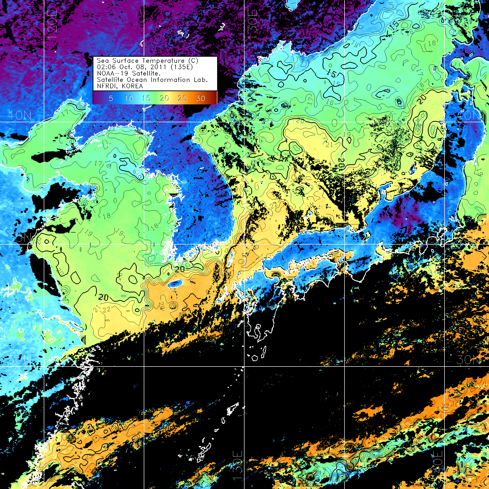 o 2011년 10월 08일 02시 06분 NOAA-18호 위성영상입니다. o 수온분포는 범례를 참고하시기 바랍니다. o 검은색은 구름을 나타냅니다. o 그림을 클릭하시면 크게 보실 수 있습니다.