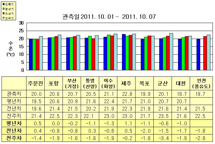 o 금주(2011.10.01~2011.10.07)의 한반도 연안 표면수온은 동해 연안역에서 섭씨 20~21도, 남해 연안역 20.5~23.0도, 서해 연안역에서 19.5~20.5도로 나타납니다. o 평년에 비해 주문진 0.5도 높음을 제외한 동해 연안역은 비슷하게, 제주 1.1도 높음을 제외한 남해 연안역은 1.0~1.5도 낮게, 서해 연안역은 0.5~1.5도 낮게 나타납니다. o 전년에 비해 주문진 0.4도 높음을 제외한 동해 연안역은 1도 낮게, 여수(화양) 0.8도 낮음을 제외한 남해 연안역은 0.5도 높게, 서해 연안역은 1.5~2.0도 낮게 나타납니다.