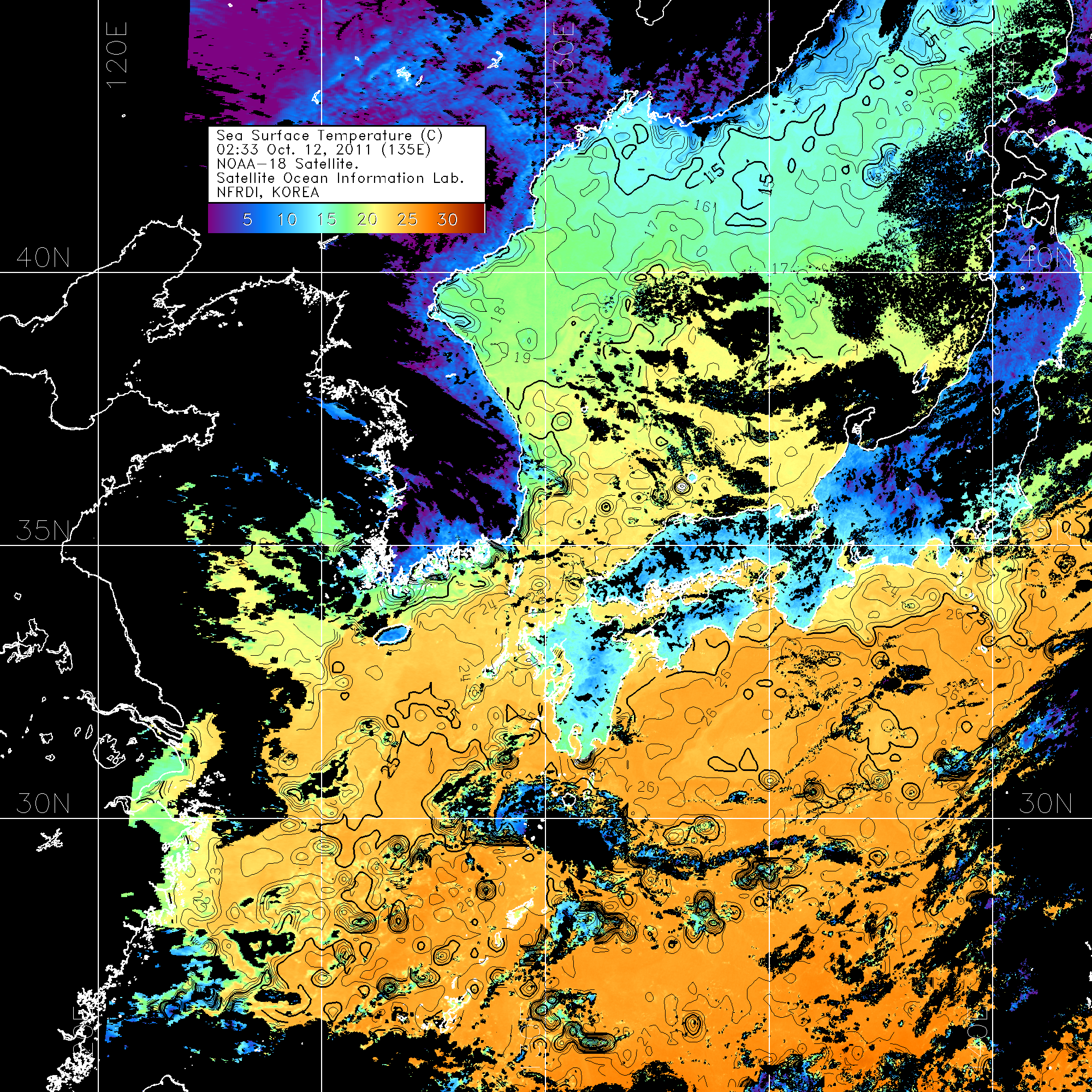 o 2011년 10월 12일 02시 33분 NOAA-18호 위성영상입니다. o 수온분포는 범례를 참고하시기 바랍니다. o 검은색은 구름을 나타냅니다. o 그림을 클릭하시면 크게 보실 수 있습니다.