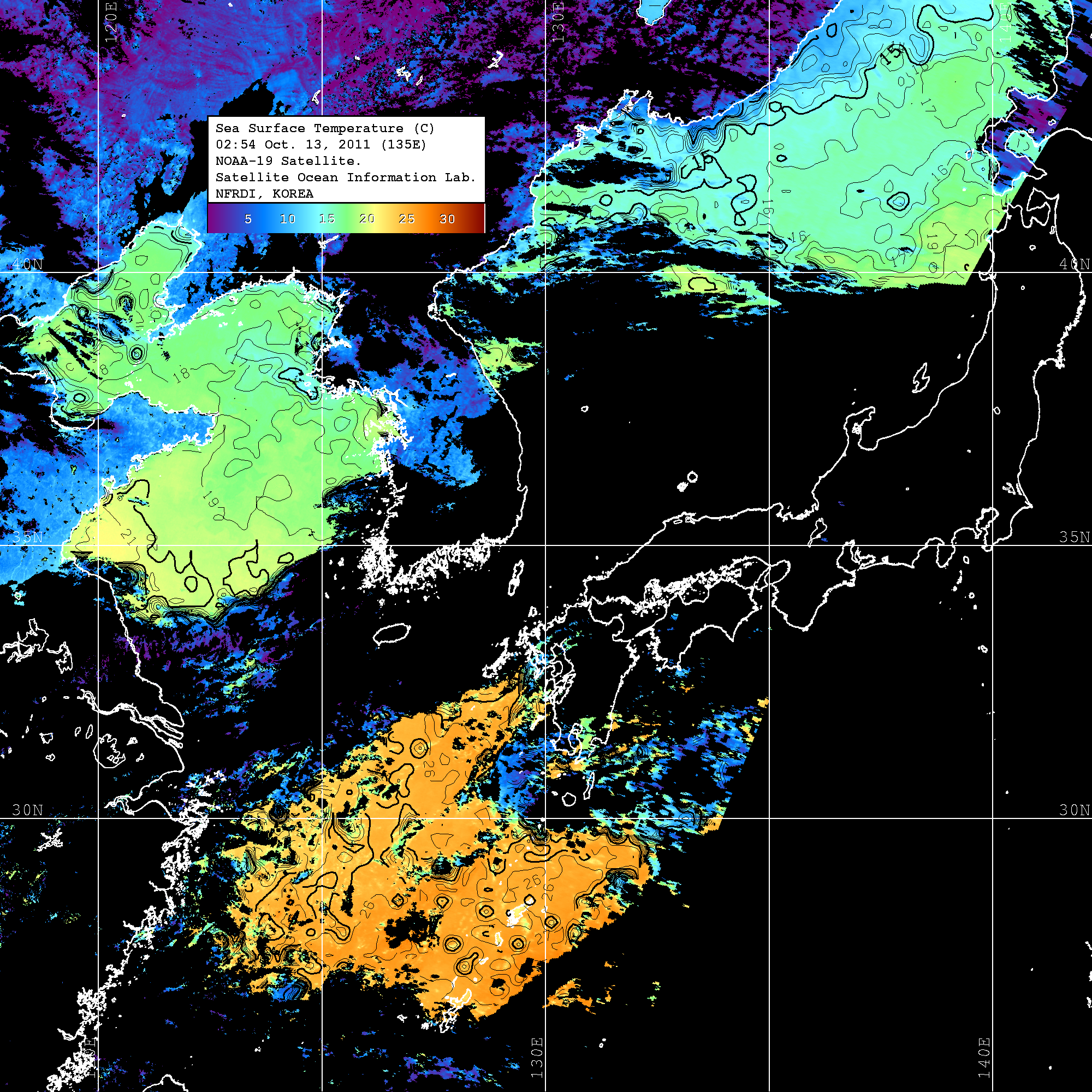 o 2011년 10월 13일 02시 54분 NOAA-19호 위성영상입니다. o 수온분포는 범례를 참고하시기 바랍니다. o 검은색은 구름을 나타냅니다. o 그림을 클릭하시면 크게 보실 수 있습니다.