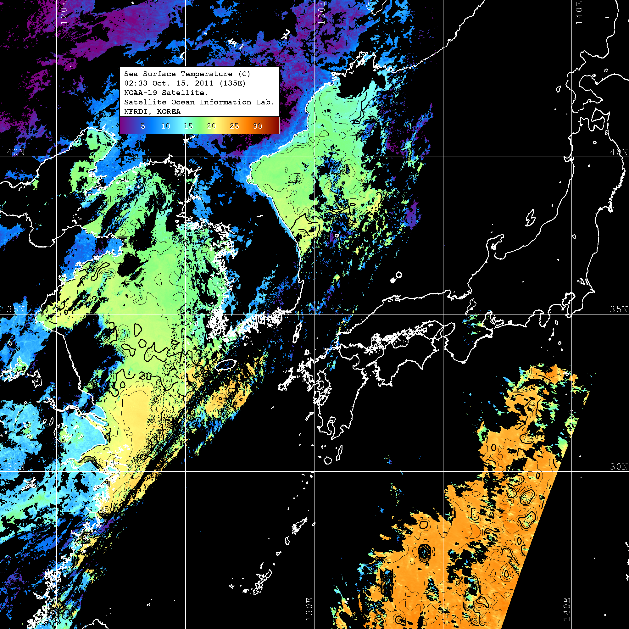 o 2011년 10월 15일 02시 33분 NOAA-19호 위성영상입니다. o 수온분포는 범례를 참고하시기 바랍니다. o 검은색은 구름을 나타냅니다. o 그림을 클릭하시면 크게 보실 수 있습니다.