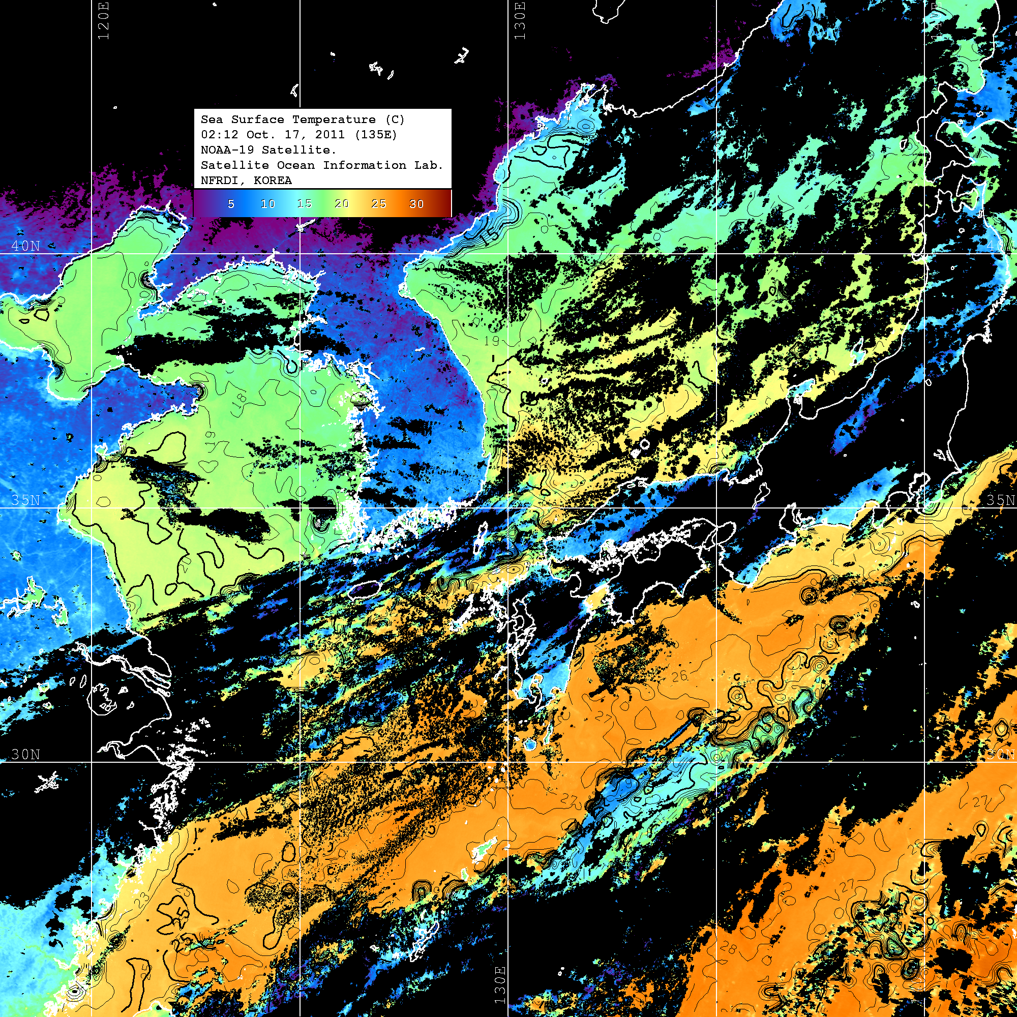 o 2011년 10월 17일 02시 12분 NOAA-19호 위성영상입니다. o 수온분포는 범례를 참고하시기 바랍니다. o 검은색은 구름을 나타냅니다. o 그림을 클릭하시면 크게 보실 수 있습니다.
