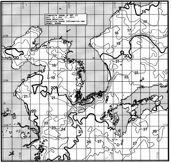 o 금주(2011.10.11~2011.10.17)의 한국근해 표면수온은 대화퇴 근해 18~19도, 울릉도 근해 21~22도, 대마도 근해 24~25도, 제주도 근해 24~25도, 이어도 근해 24~25도, 가거초 근해 20~21도, 어청도 근해 18~19도로 나타납니다. o「평년에 비해」대화퇴 근해 0.7도 낮게, 울릉도 근해 0.8도 높게, 대마도 근해 0.9도 높게, 제주도 근해 1.6도 높게, 이어도 근해 1.4도 높게, 가거초 근해 0.3도 높게, 어청도 근해는 0.5도 낮게 나타납니다. o「전년에 비해」대화퇴 근해 3.5도 낮게, 울릉도 근해 비슷하게, 대마도 근해 1도 낮게, 제주도 근해 1도 높게, 이어도 근해 2도 높게, 가거초 근해 비슷하게, 어청도 근해는 2도 낮게 나타납니다. o 수온 전선대는 우리나라 제주해협에서 대한해협까지 23도를 중심으로 형성됩니다.