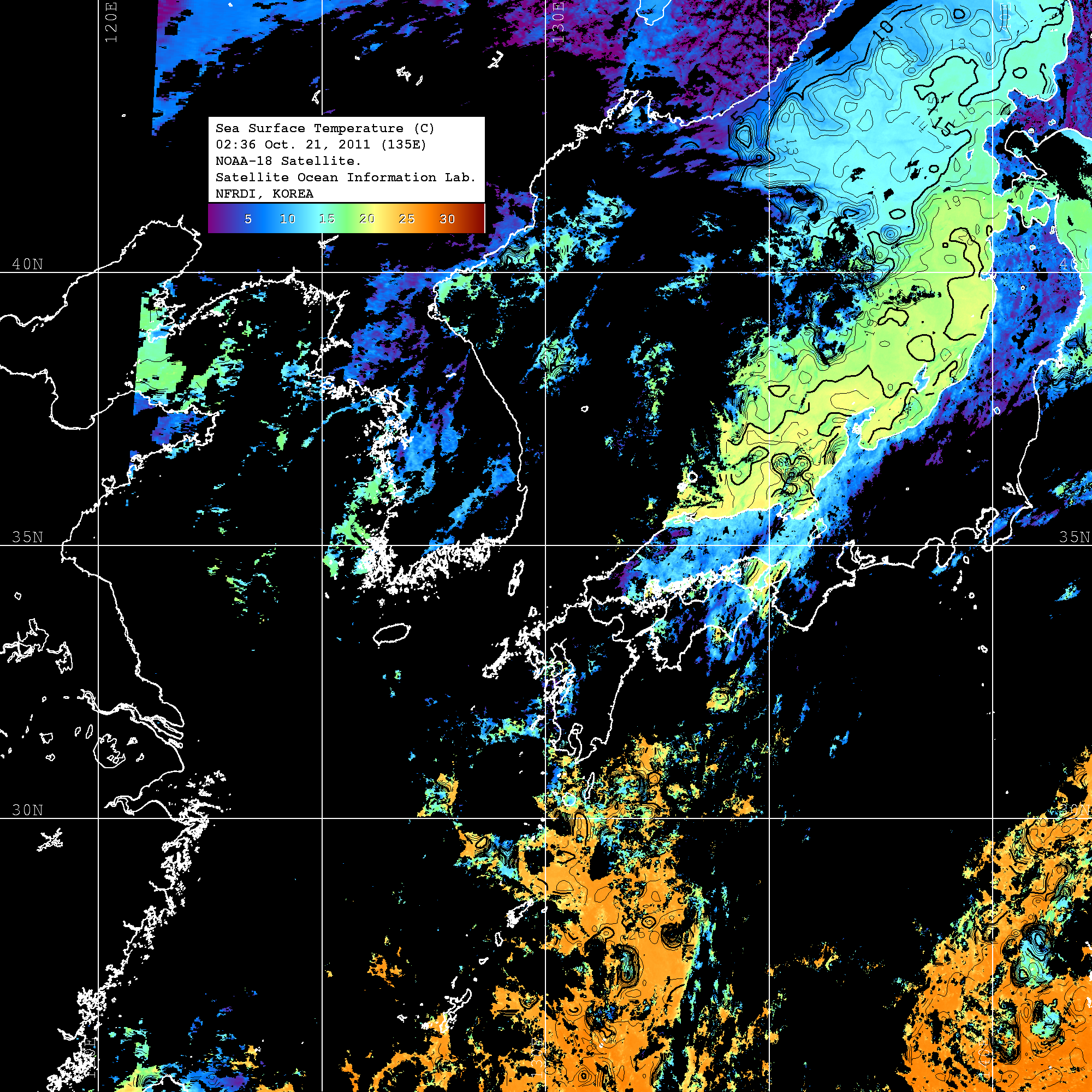 o 2011년 10월 21일 2시 36분 NOAA-18호 위성영상입니다. o 수온분포는 범례를 참고하시기 바랍니다. o 검은색은 구름을 나타냅니다. o 그림을 클릭하시면 크게 보실 수 있습니다.