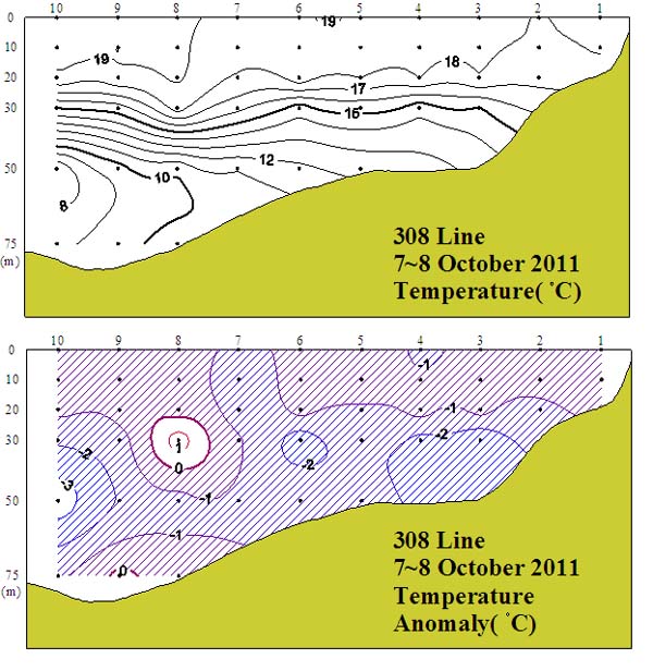 ㅇ 2011년 10월 7~8일 국립수산과학원 서해수산연구소에서 조사한 308선(대천 서방)의 수직수온분포도 및 평년편차도입니다. ㅇ 수온약층은 14℃를 중심으로 20~50m 부근에서 형성되었으며 연안으로 갈수록 약하게 형성되었습니다. ㅇ 평년에 비하여 전 수층에 걸쳐 대체로 1~3℃의 저온현상을 보였습 니다.