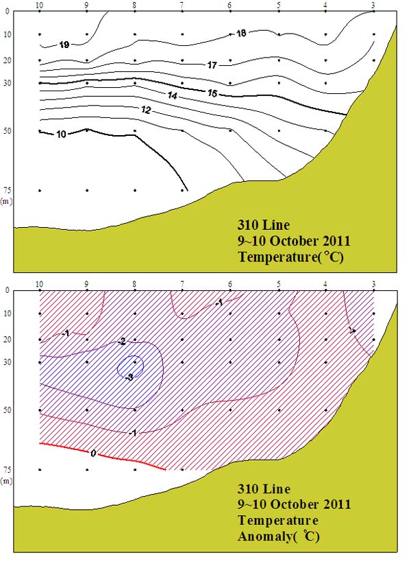 ㅇ 2011년 10월 9~10일 국립수산과학원 서해수산연구소에서 조사한 310선(영광 서방)의 수직수온분포도 및 평년편차도입니다. ㅇ 14℃를 중심으로 한 수온약층이 외해역에서는 30m를 중심으로 나타났으나, 연안역 부근에서는 뚜렷하게 나타나지 않았습니다. ㅇ 평년에 비하여 전 수층에 걸쳐 대체로 1~3℃의 저온현상을 보였습 니다.
