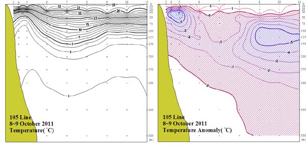 ㅇ 2011년 10월 8~9일 국립수산과학원 동해수산연구소에서 조사한 105선(동해 동방)의 수직수온분포도 및 평년편차도입니다. ㅇ 수온약층은 30~75m 층에서 15℃를 중심으로 형성되었으며, 연안역에서 강하게 형성되었습니다. ㅇ 평년에 비하여 표층에서는 1~2℃의 고온현상을 보인 반면, 20m 이심에서는 1~7℃의 저온현상을 보였으며, 특히 연안역 50m 수층 및 외해역 125m 수층에서 5℃ 이상의 저온현상을 보였습니다.