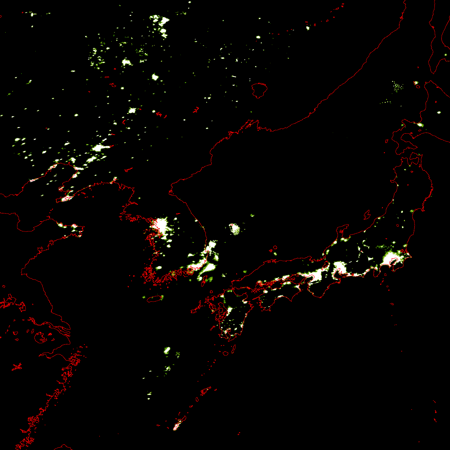 o 2011년 10월 24일 19시 22분 DMSP/OLS(Detense Meteorological Satellite Program/Operating Linescan System) 영상입니다. o DMSP/OLS는 야간 불빛을 탐지하는 위성으로, 야간 조업 어선 분포 현황을 알 수 있습니다. o 그림을 클릭하시면 크게 보실 수 있습니다.