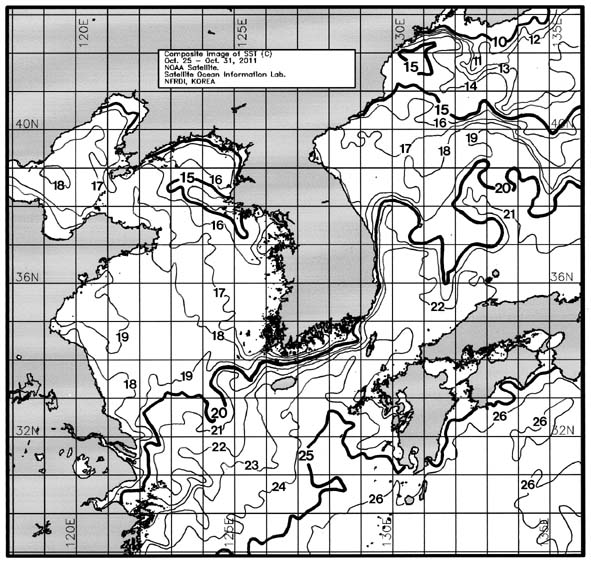 o 금주(2011.10.25~2011.10.31)의 한국근해 표면수온은 대화퇴 근해 17~18도, 울릉도 근해 19~20도, 대마도 근해 22~24도, 제주도 근해 22~24도, 이어도 근해 21~22도, 가거초 근해 18~19도, 어청도 근해 16~17도로 나타납니다. o「평년에 비해」대화퇴 근해 비슷하게, 울릉도 근해 0.8도 높게, 대마도 근해 0.5도 낮게, 제주도 근해 1.5도 높게, 이어도 근해 0.4도 낮게, 가거초 근해 0.3도 낮게, 어청도 근해는 1도 낮게 나타납니다. o「전년에 비해」대화퇴 근해 2도 낮게, 울릉도 근해 비슷하게, 대마도 근해 1.5도 낮게, 제주도 근해 비슷하게, 이어도 근해 비슷하게, 가거초 근해 비슷하게, 어청도 근해는 비슷하게 나타납니다. o 수온 전선대는 우리나라 제주해협에서 대한해협까지 22도를 중심으로 형성됩니다.