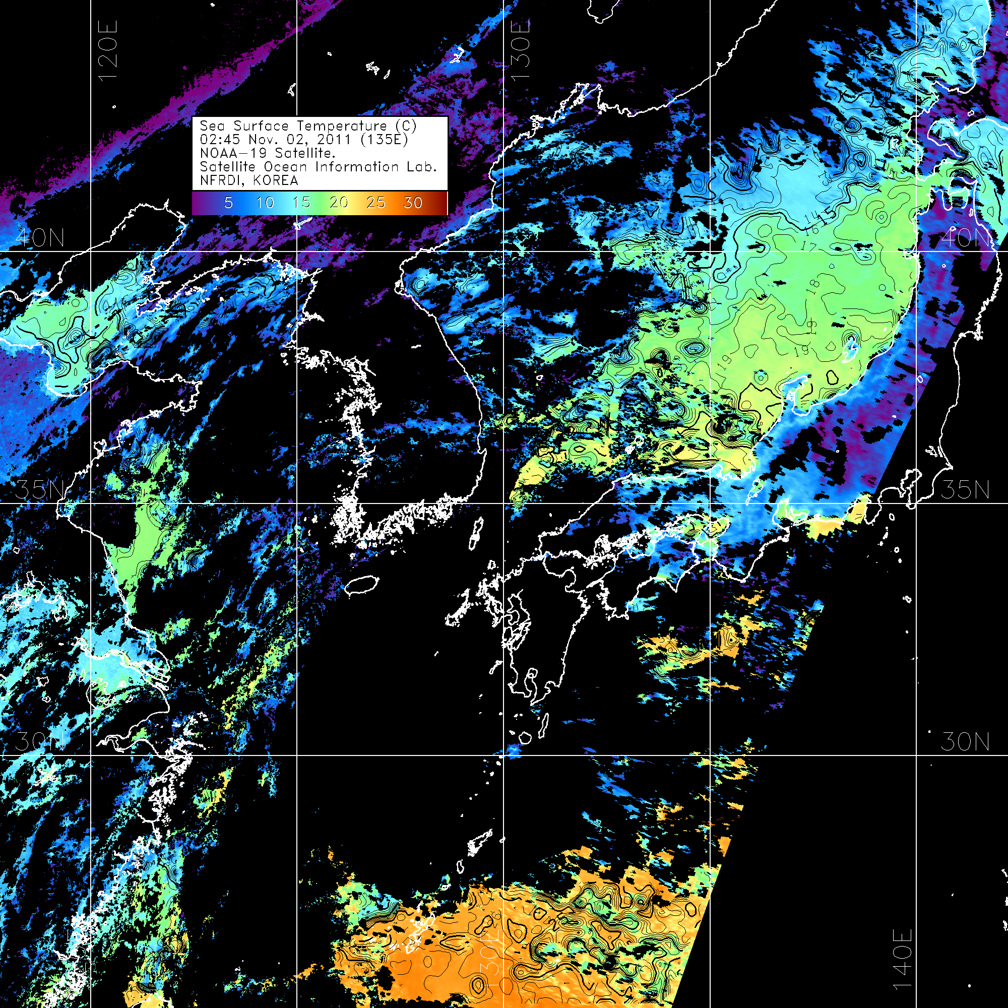 o 2011년 11월 02일 02시 45분 NOAA-19호 위성영상입니다. o 수온분포는 범례를 참고하시기 바랍니다. o 검은색은 구름을 나타냅니다. o 그림을 클릭하시면 크게 보실 수 있습니다.