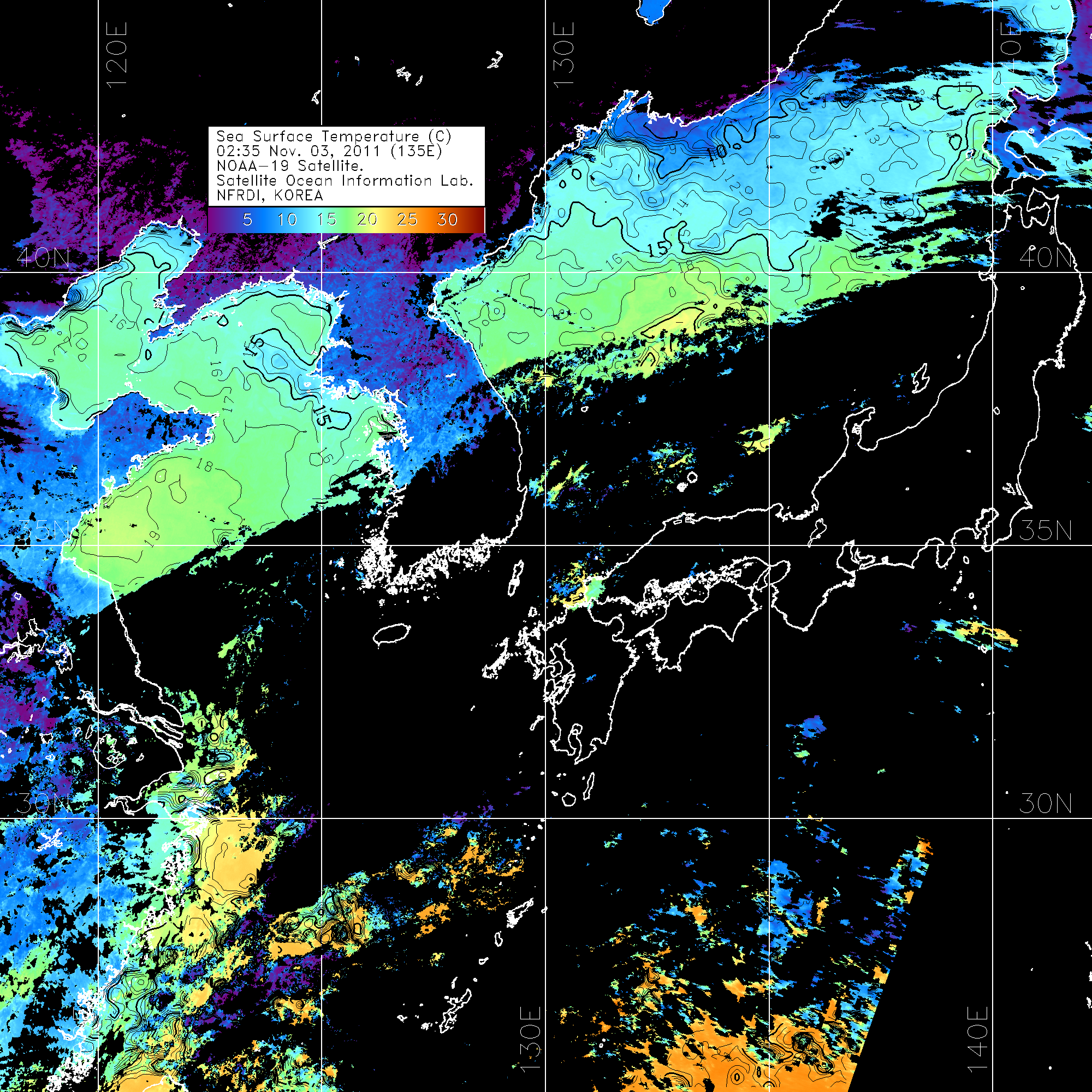 o 2011년 11월 03일 02시 35분 NOAA-19호 위성영상입니다. o 수온분포는 범례를 참고하시기 바랍니다. o 검은색은 구름을 나타냅니다. o 그림을 클릭하시면 크게 보실 수 있습니다.
