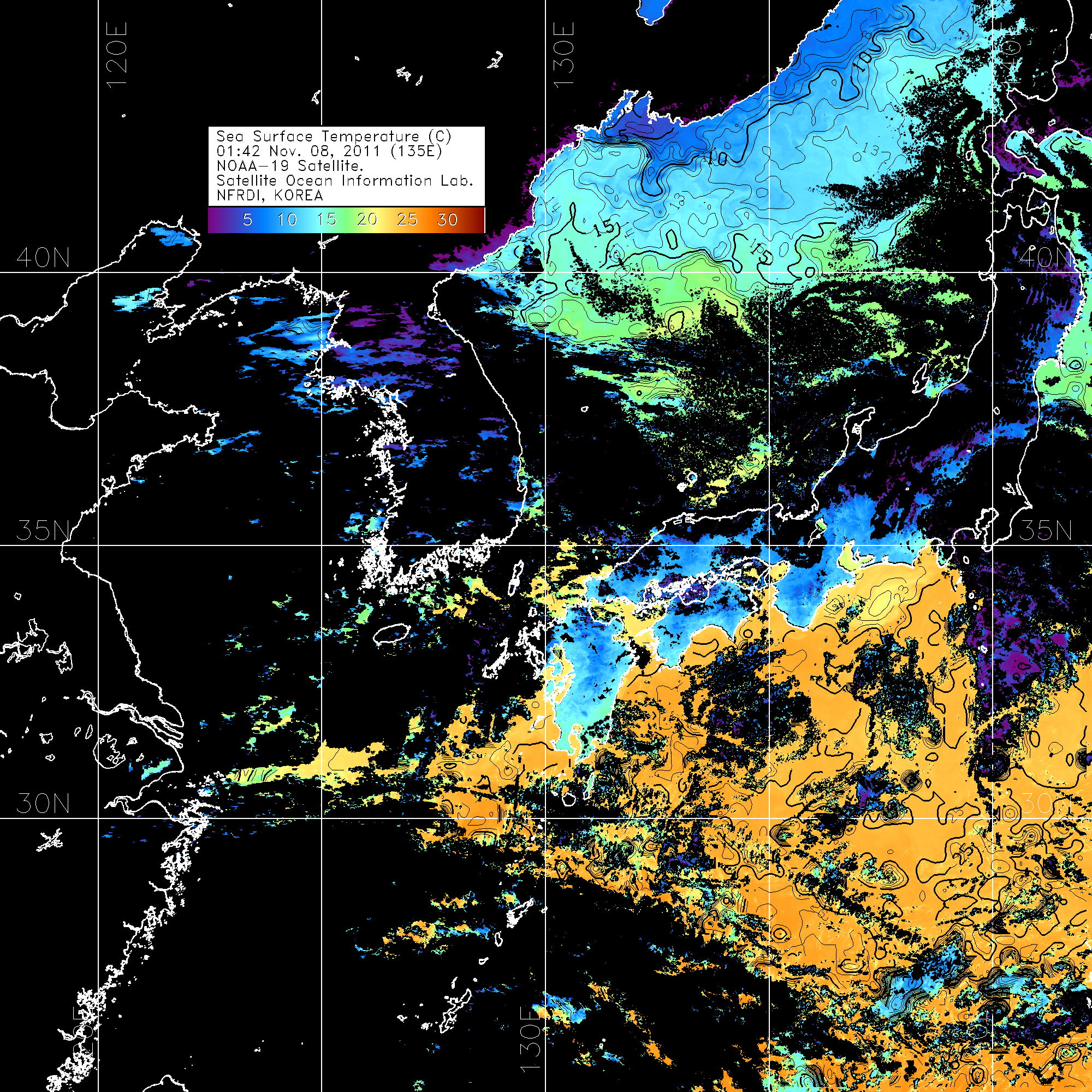 o 2011년 11월 07일 01시 42분 NOAA-19호 위성영상입니다. o 수온분포는 범례를 참고하시기 바랍니다. o 검은색은 구름을 나타냅니다. o 그림을 클릭하시면 크게 보실 수 있습니다.