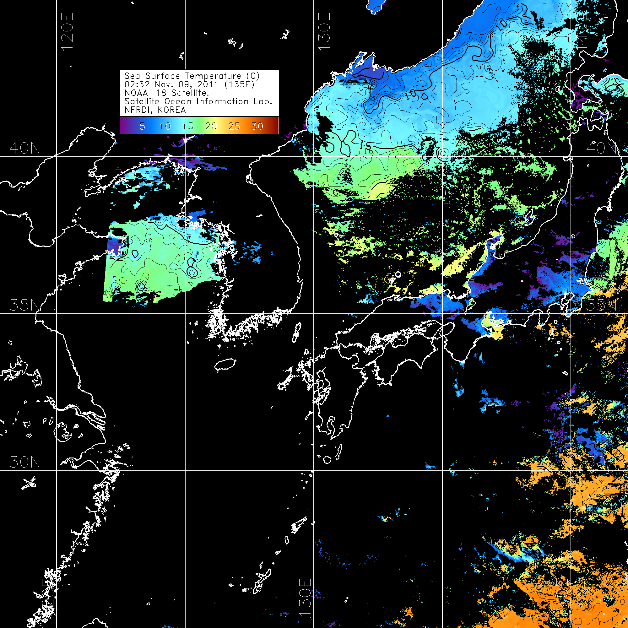 o 2011년 11월 09일 02시 32분 NOAA-18호 위성영상입니다. o 수온분포는 범례를 참고하시기 바랍니다. o 검은색은 구름을 나타냅니다. o 그림을 클릭하시면 크게 보실 수 있습니다.