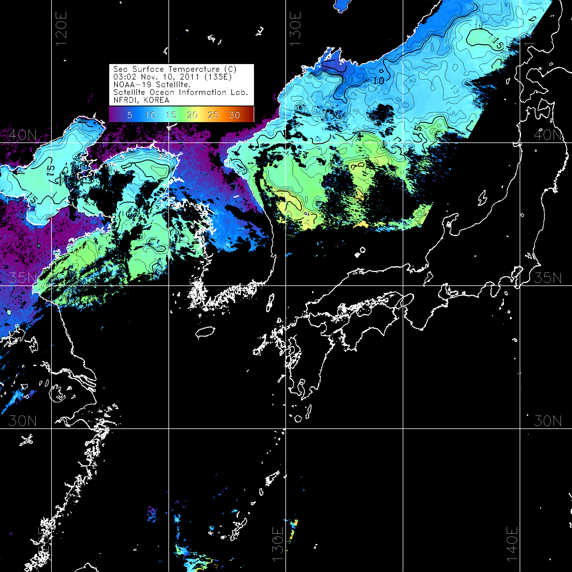 o 2011년 11월 10일 03시 02분 NOAA-19호 위성영상입니다. o 수온분포는 범례를 참고하시기 바랍니다. o 검은색은 구름을 나타냅니다. o 그림을 클릭하시면 크게 보실 수 있습니다.