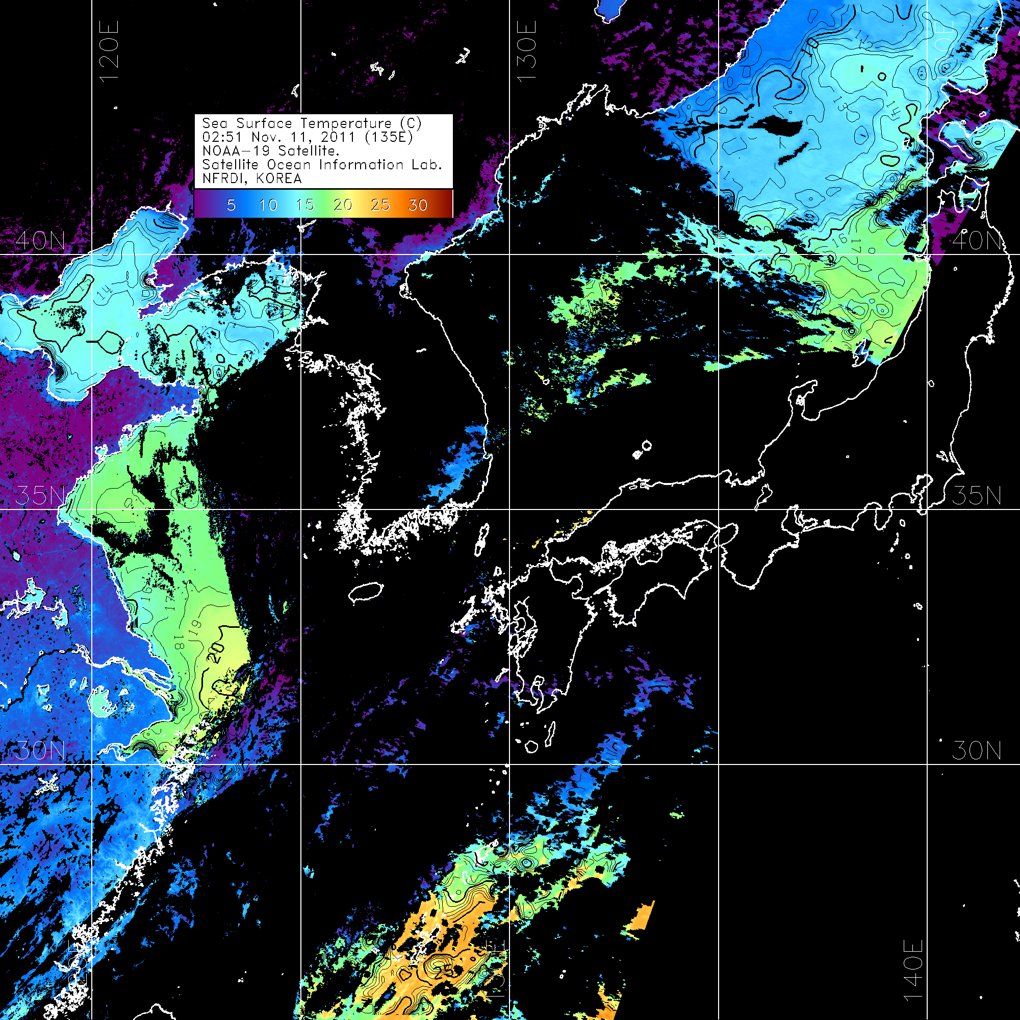 o 2011년 11월 11일 02시 51분 NOAA-19호 위성영상입니다. o 수온분포는 범례를 참고하시기 바랍니다. o 검은색은 구름을 나타냅니다. o 그림을 클릭하시면 크게 보실 수 있습니다.
