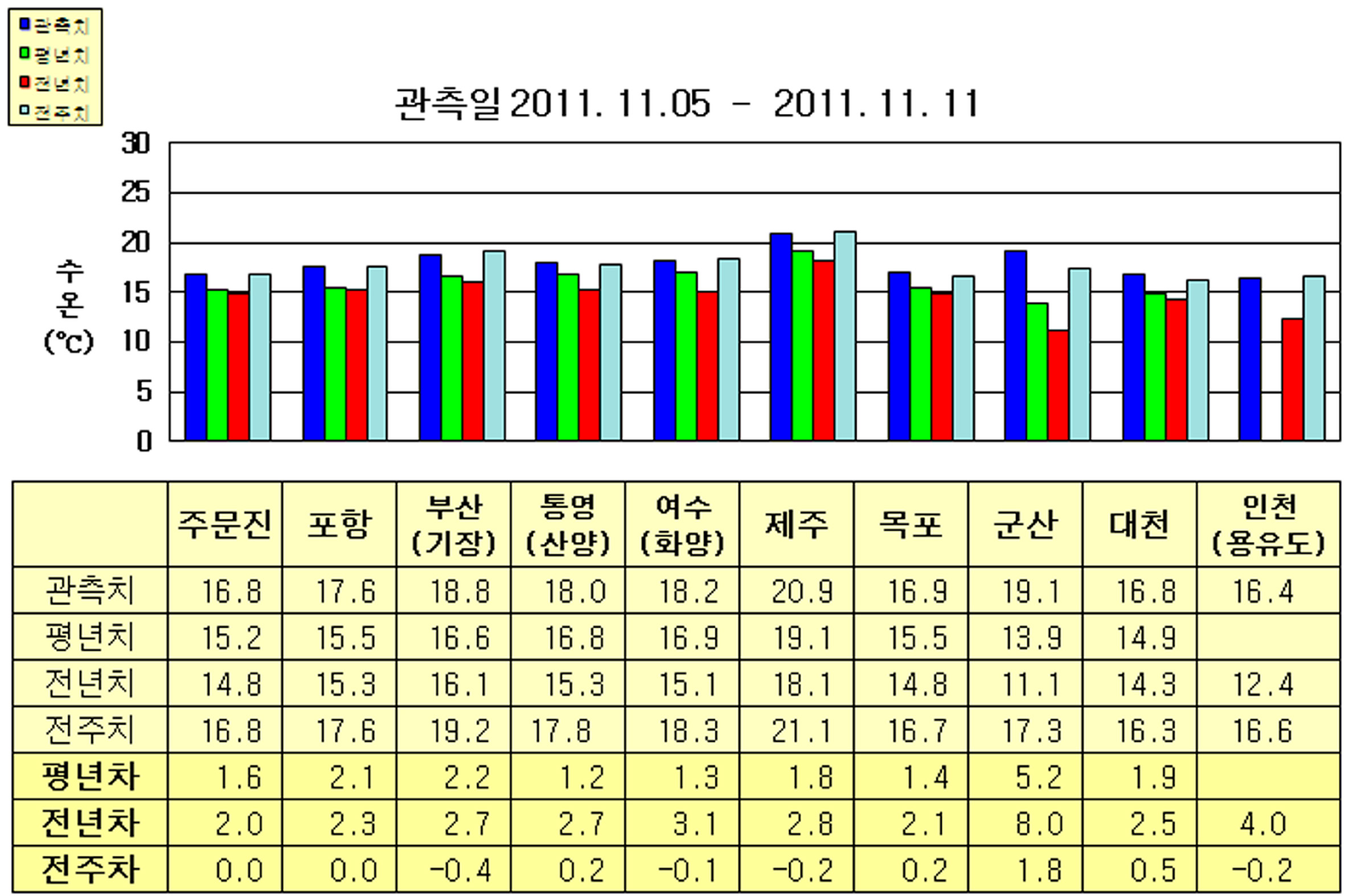 o 금주(2011.11.05~2011.11.11)의 한반도 연안 표면수온은 동해 연안역에서 섭씨 16.5~19.0도, 남해 연안역 18~21도, 서해 연안역에서 16~19도로 나타납니다. o 평년에 비해 동해 연안역은 1.5~2.5도 높게, 남해 연안역은 1~2도 높게, 서해 연안역은 1~5도 높게 나타납니다. o 전년에 비해 동해 연안역은 2~3도 높게, 남해 연안역은 2.5~3.0도 높게, 서해 연안역은 2~8도 높게 나타납니다.