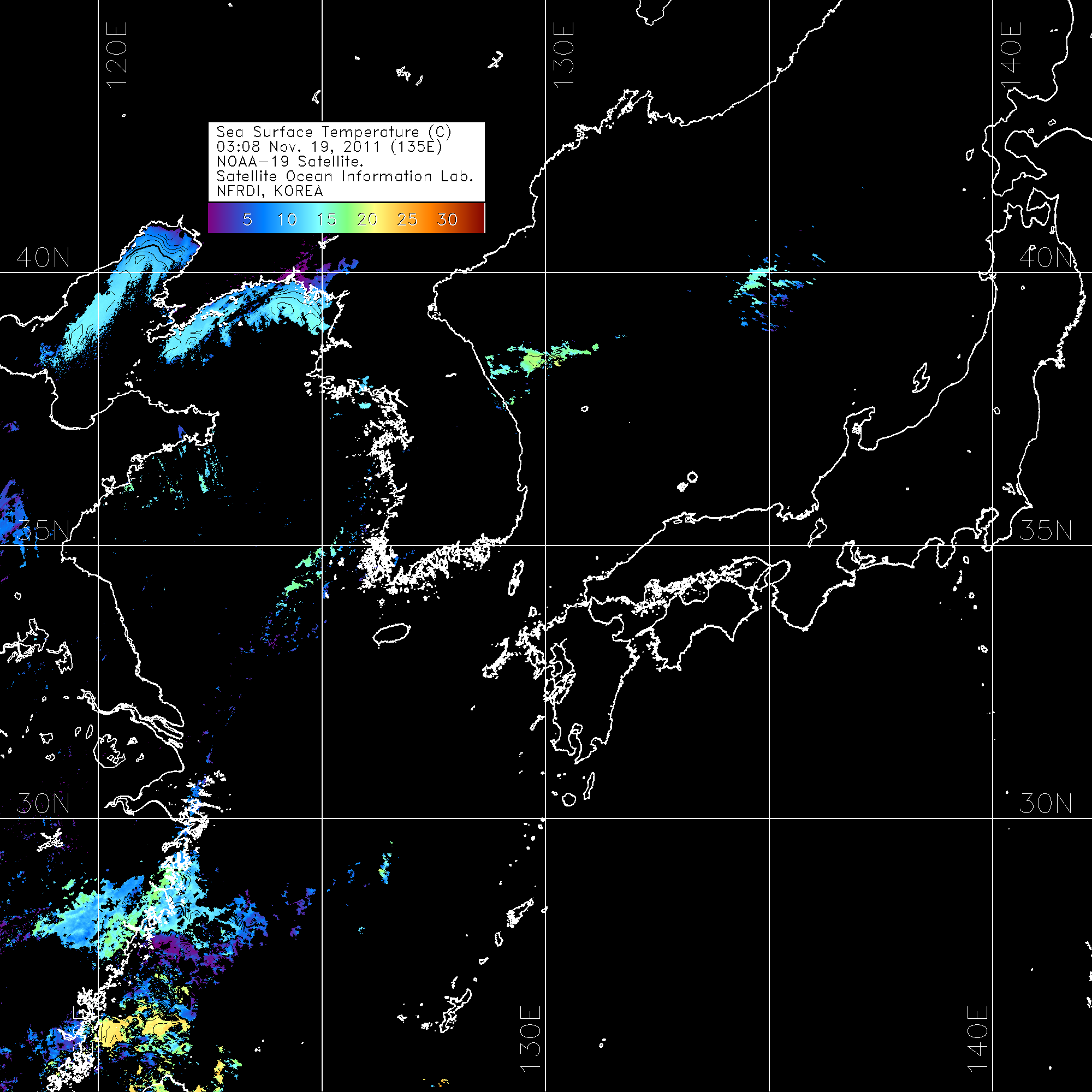 o 2011년 11월 19일 NOAA 위성영상입니다. o 영상 시간 및 수온분포는 범례를 참고하시기 바랍니다. o 검은색은 구름을 나타냅니다. o 그림을 클릭하시면 크게 보실 수 있습니다.