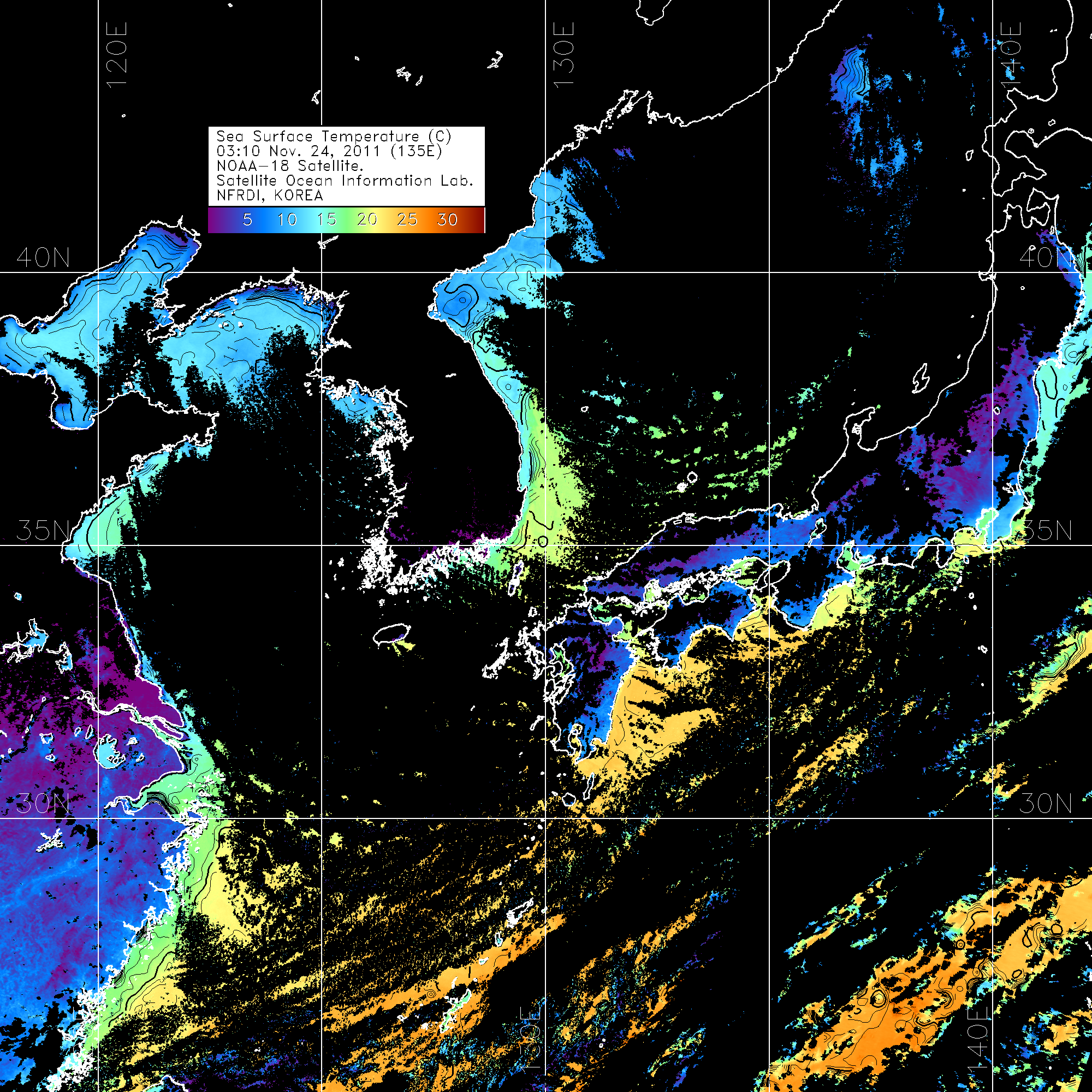o 2011년 11월 24일 NOAA 위성영상입니다. o 영상 시간 및 수온분포는 범례를 참고하시기 바랍니다. o 검은색은 구름을 나타냅니다. o 그림을 클릭하시면 크게 보실 수 있습니다.