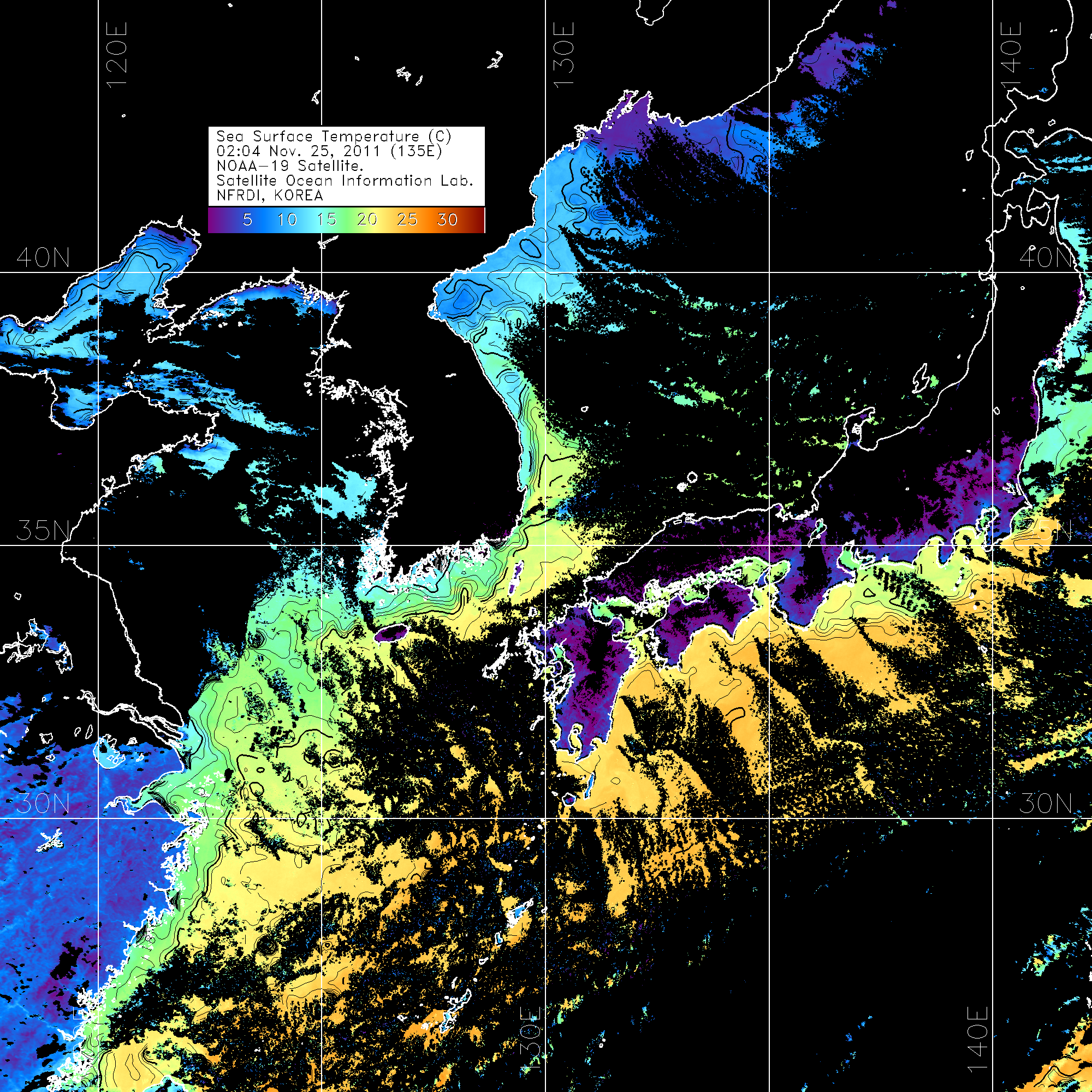 o 2011년 11월 25일 NOAA 위성영상입니다. o 영상 시간 및 수온분포는 범례를 참고하시기 바랍니다. o 검은색은 구름을 나타냅니다. o 그림을 클릭하시면 크게 보실 수 있습니다.