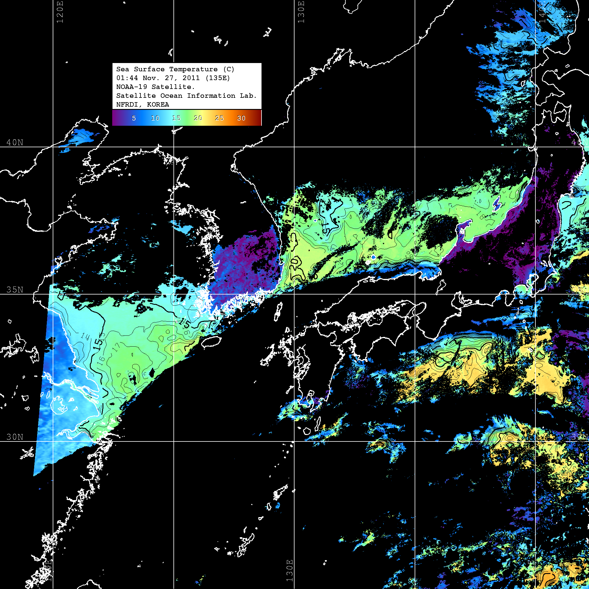 o 2011년 11월 27일 NOAA 위성영상입니다. o 영상 시간 및 수온분포는 범례를 참고하시기 바랍니다. o 검은색은 구름을 나타냅니다. o 그림을 클릭하시면 크게 보실 수 있습니다.