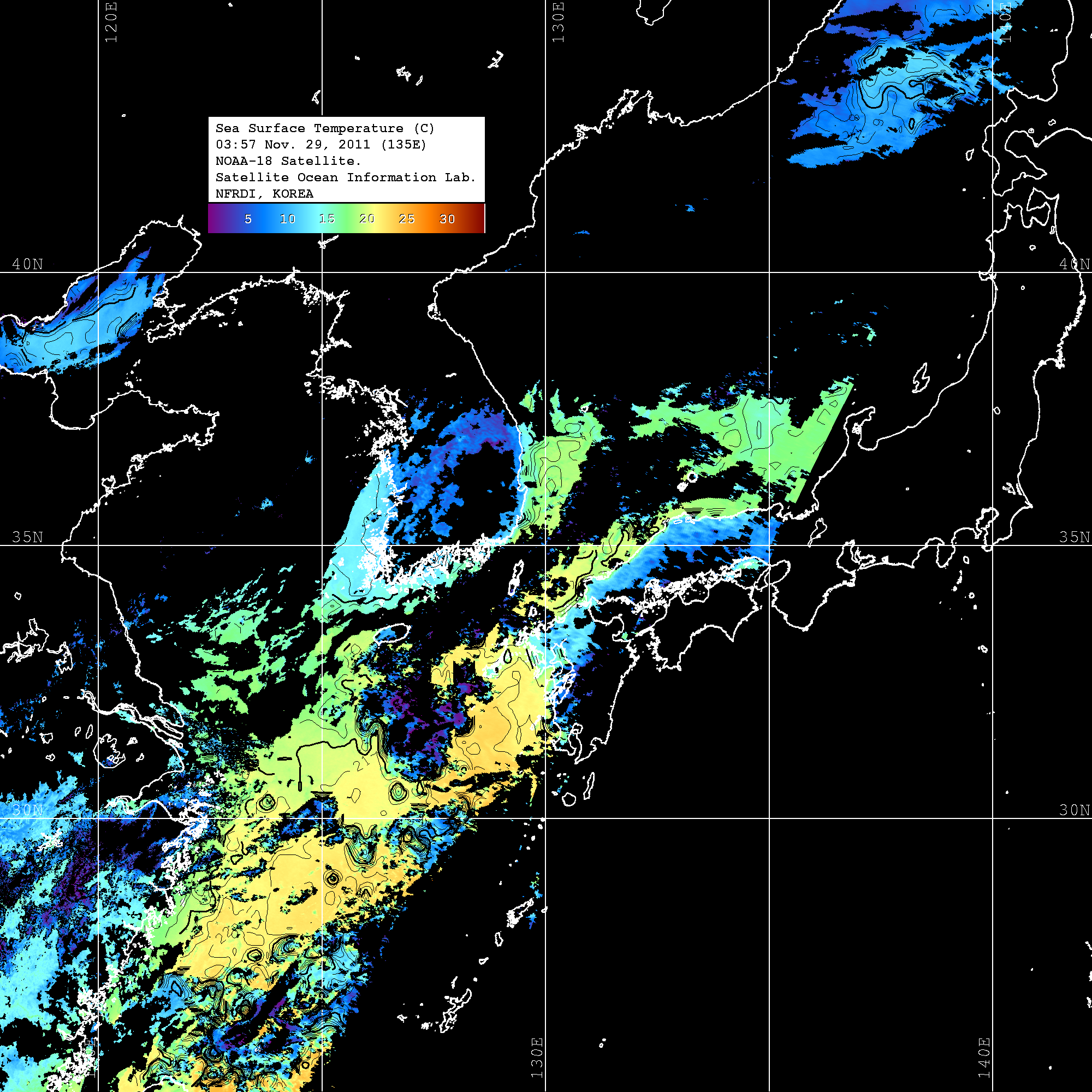 o 2011년 11월 29일 NOAA 위성영상입니다. o 영상 시간 및 수온분포는 범례를 참고하시기 바랍니다. o 검은색은 구름을 나타냅니다. o 그림을 클릭하시면 크게 보실 수 있습니다.