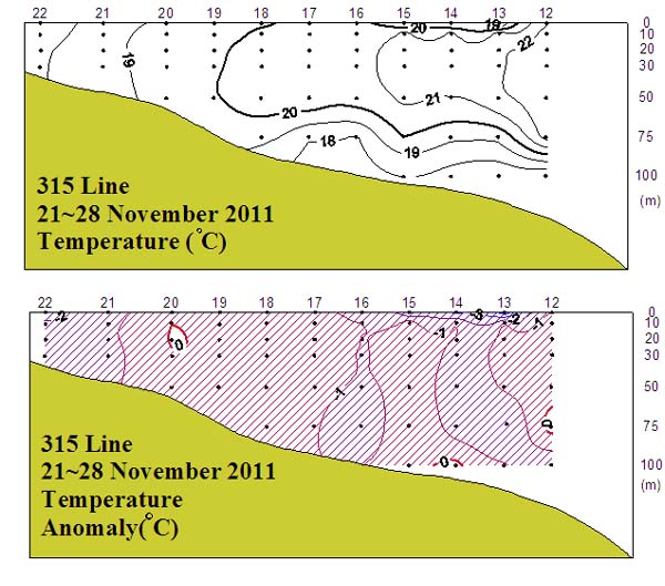 o 2011년 11월 21~28일 국립수산과학원 남서해수산연구소에서 조사한 동중국해 북부해역(315선)의 수온 수직분포도와 평년편차도입니다. o 19℃를 중심으로 한 수온약층은 수심 75~100m에서 약하게 형성되었고 관측 해역 내에서 동쪽이 서쪽에 비해 수온이 높게 나타났습니다. o 평년에 비하여 표층 일부 해역을 제외한 대부분의 해역에서 1~2.5℃의 저온현상을 나타내었습니다.