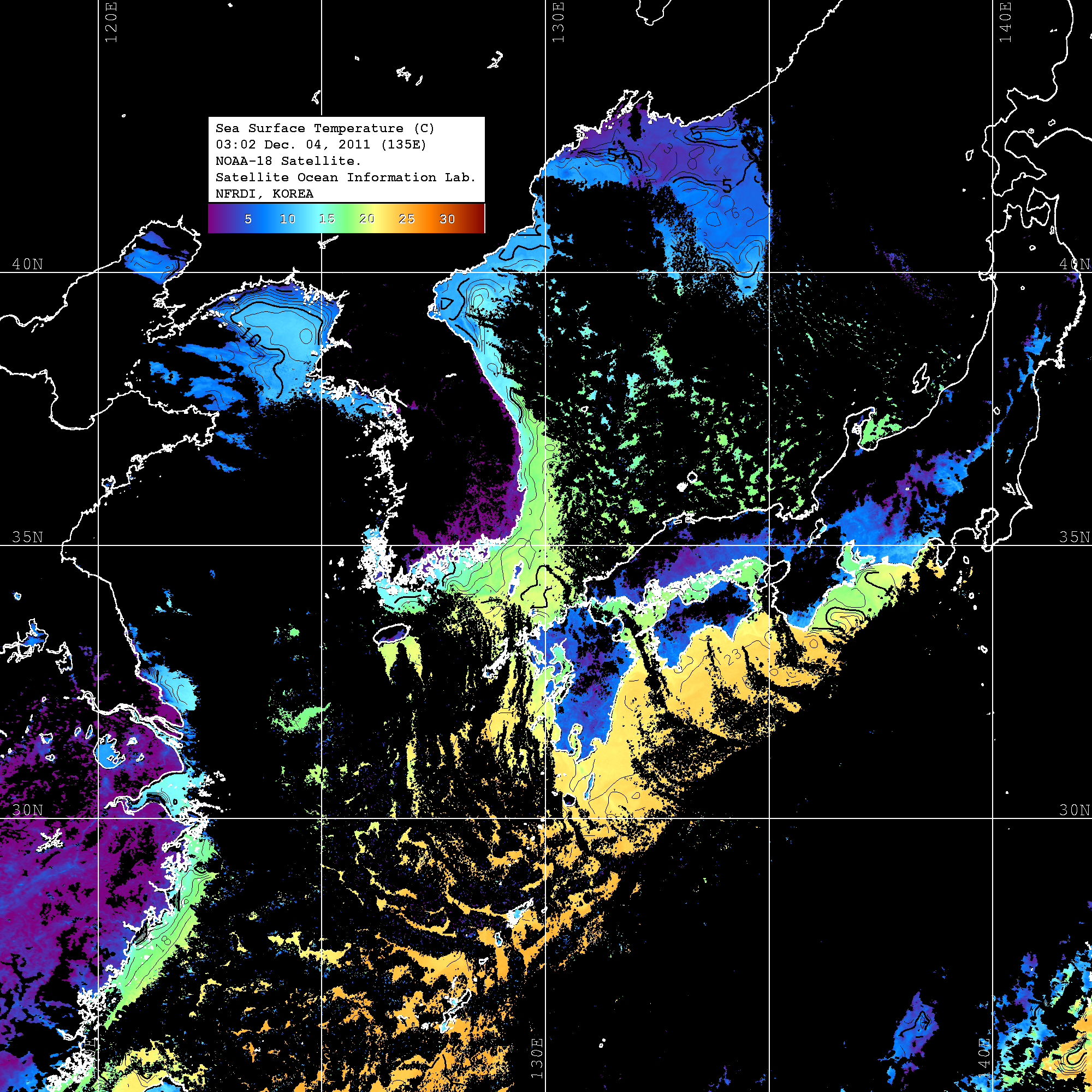 o 2011년 12월 04일 NOAA 위성영상입니다. o 영상 시간 및 수온분포는 범례를 참고하시기 바랍니다. o 검은색은 구름을 나타냅니다. o 그림을 클릭하시면 크게 보실 수 있습니다.
