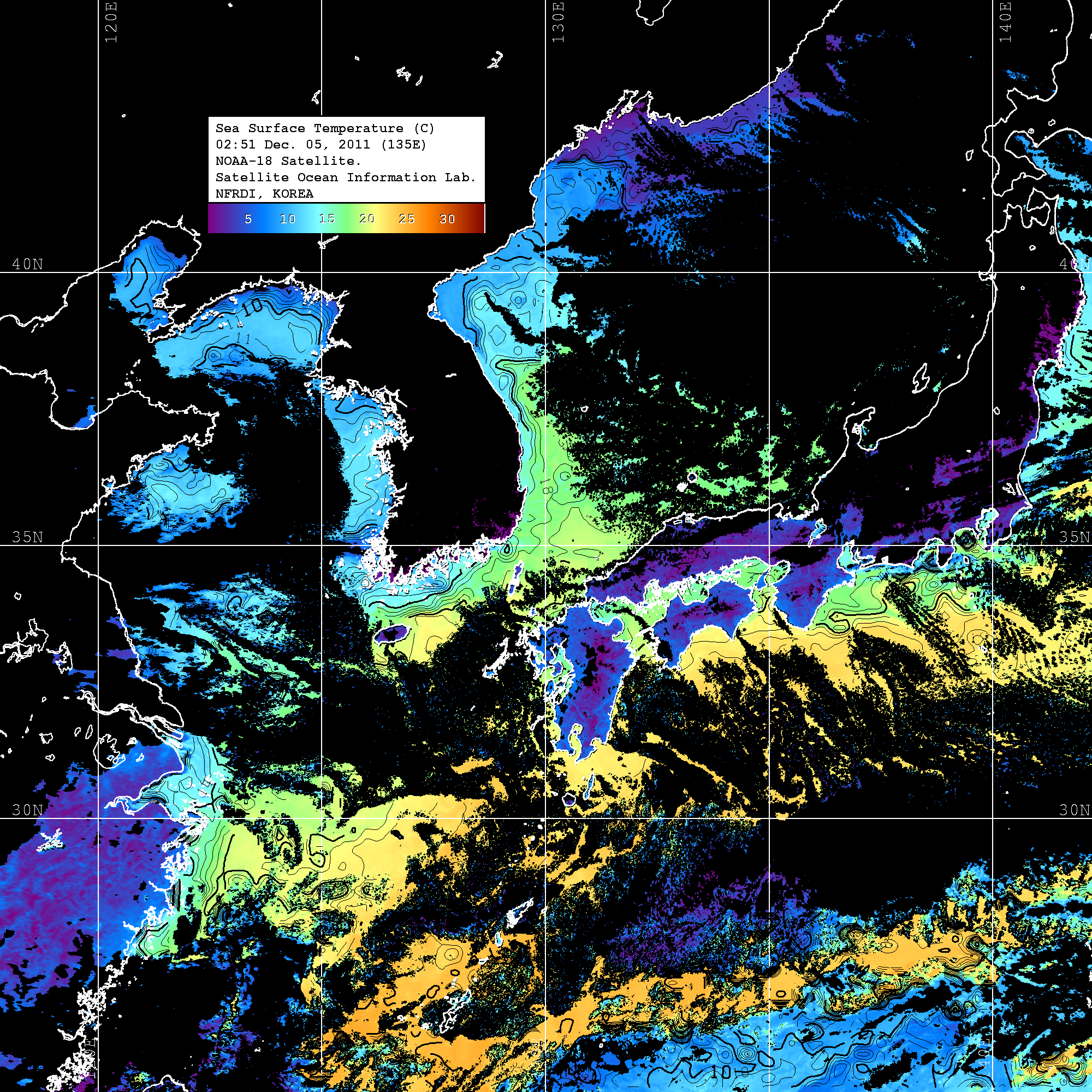 o 2011년 12월 05일 NOAA 위성영상입니다. o 영상 시간 및 수온분포는 범례를 참고하시기 바랍니다. o 검은색은 구름을 나타냅니다. o 그림을 클릭하시면 크게 보실 수 있습니다.