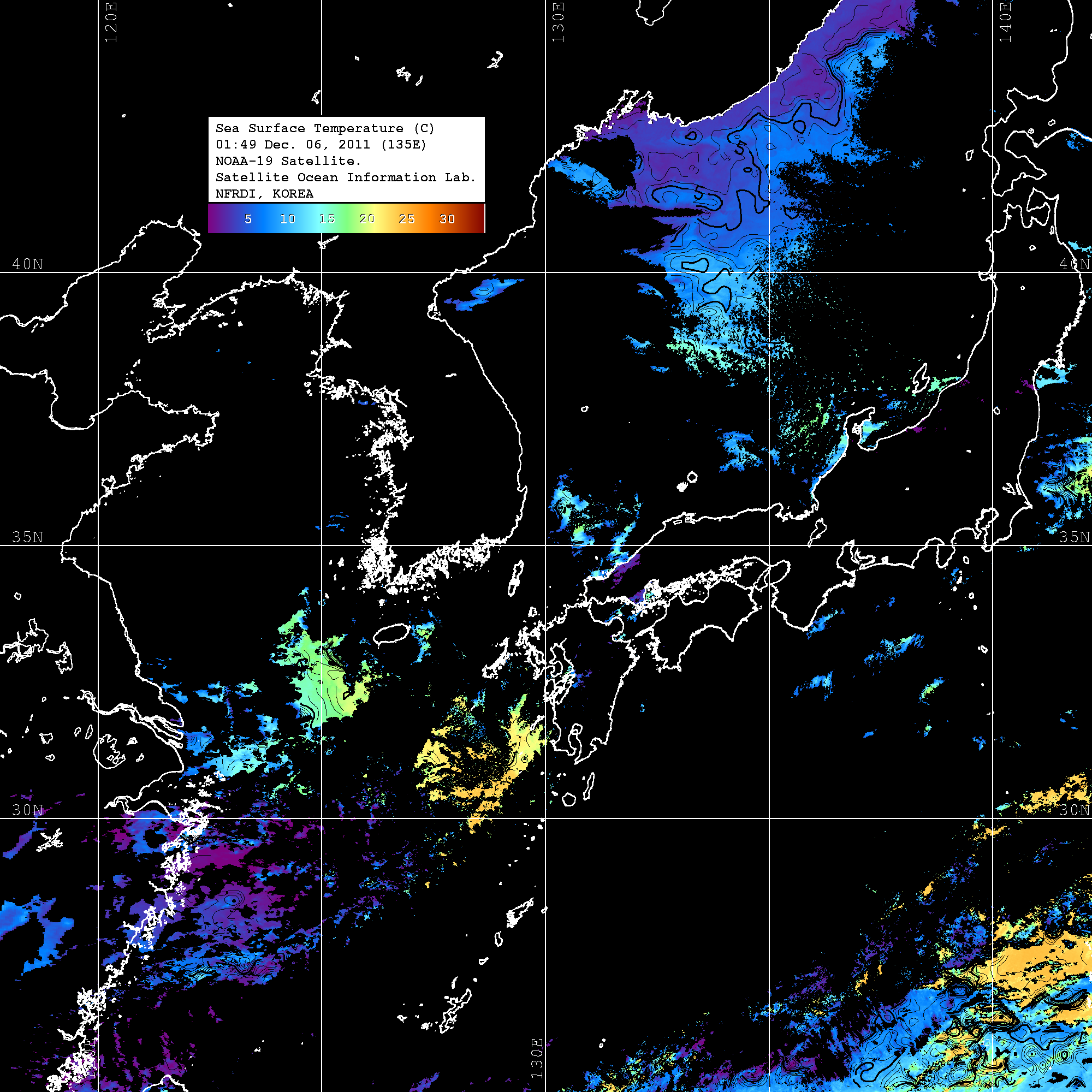 o 2011년 12월 06일 NOAA 위성영상입니다. o 영상 시간 및 수온분포는 범례를 참고하시기 바랍니다. o 검은색은 구름을 나타냅니다. o 그림을 클릭하시면 크게 보실 수 있습니다.