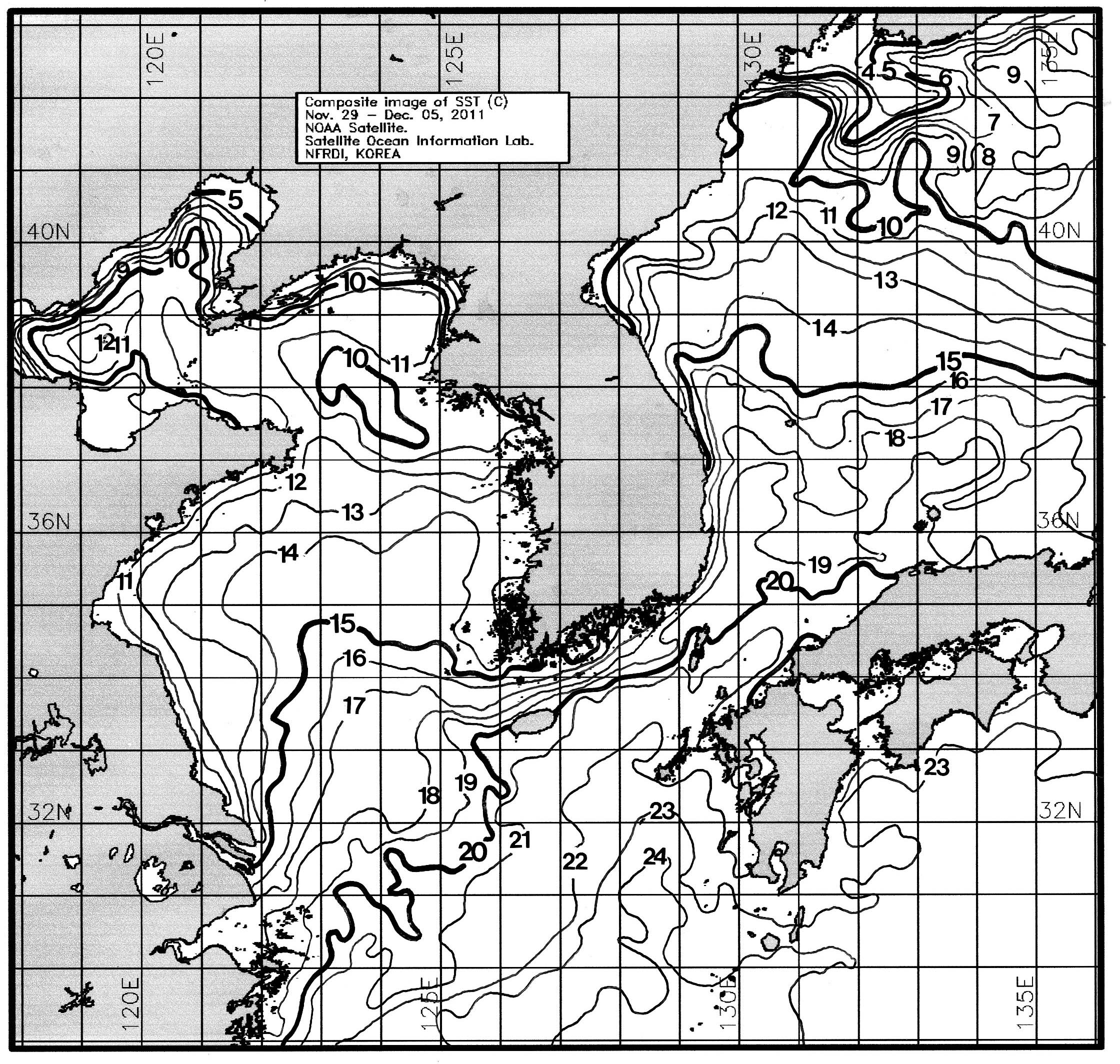 o 금주(2011.11.29~2011.12.05)의 한국근해 표면수온은 대화퇴 근해 10~11도, 울릉도 근해 17~18도, 대마도 근해 20~21도, 제주도 근해 19~20도, 이어도 근해 18~19도, 가거초 근해 15~16도, 어청도 근해 13~14도로 나타납니다. o「평년에 비해」대화퇴 근해 1.5도 낮게, 울릉도 근해 1.8도 높게, 대마도 근해 0.3도 높게, 제주도 근해 1도 높게, 이어도 근해 0.9도 높게, 가거초 근해 1.6도 높게, 어청도 근해는 1.5도 높게 나타납니다. o「전년에 비해」대화퇴 근해 2.5도 낮게, 울릉도 근해 1.5도 높게, 대마도 근해 비슷하게, 제주도 근해 비슷하게, 이어도 근해 1도 높게, 가거초 근해 2.5도 높게, 어청도 근해는 2.5도 높게 나타납니다. o 수온 전선대는 우리나라 제주해협에서 대한해협까지 19도를 중심으로 형성됩니다.