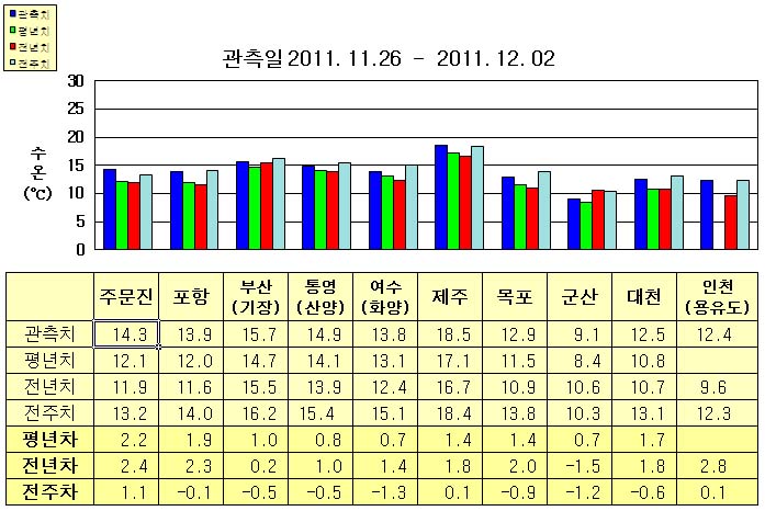 o 금주(2011.11.26~2011.12.02)의 한반도 연안 표면수온은 동해 연안역에서 섭씨 13.5~16.0도, 남해 연안역 13.5~18.5도, 서해 연안역에서 9~13도로 나타납니다. o 평년에 비해 동해 연안역은 1.0~2.5도 높게, 남해 연안역은 0.5~1.5도 높게, 서해 연안역은 0.5~2.0도 높게 나타납니다. o 전년에 비해 부산(기장) 비슷함을 제외한 동해 연안역은 2.0~2.5도 높게, 남해 연안역은 1~2도 높게, 군산 1.5도 낮음을 제외한 서해 연안역은 1.5~3.0도 높게 나타납니다.