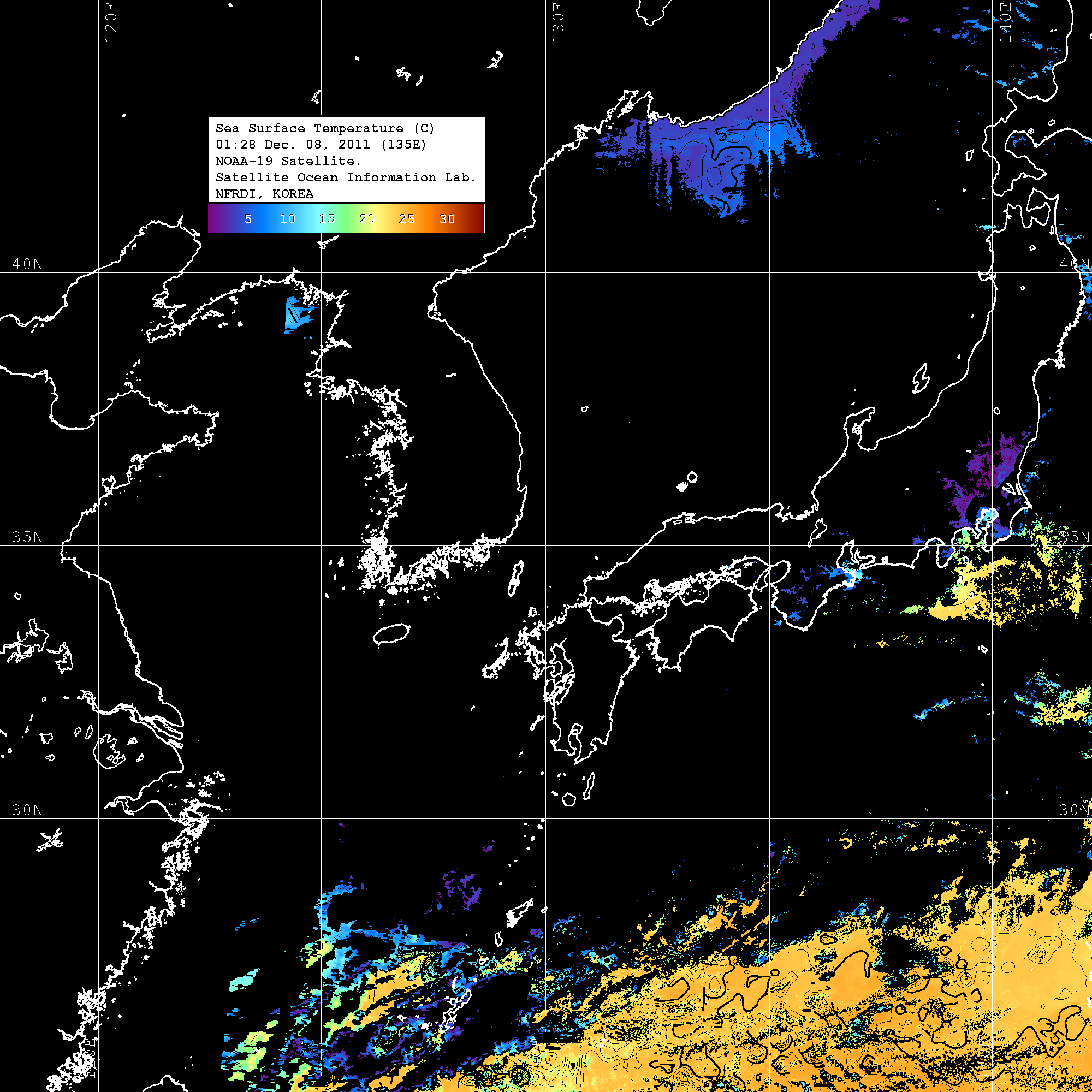 o 2011년 12월 08일 NOAA 위성영상입니다. o 영상 시간 및 수온분포는 범례를 참고하시기 바랍니다. o 검은색은 구름을 나타냅니다. o 그림을 클릭하시면 크게 보실 수 있습니다.