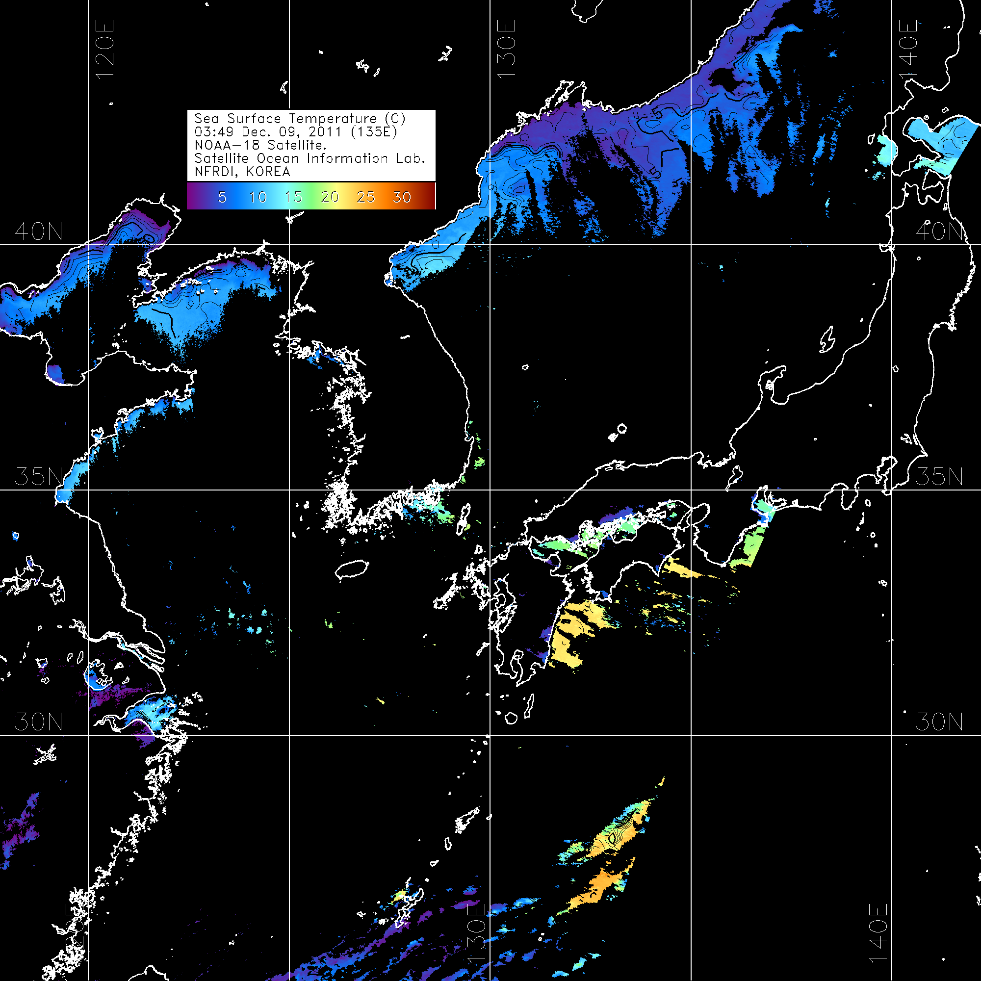 o 2011년 12월 09일 NOAA 위성영상입니다. o 영상 시간 및 수온분포는 범례를 참고하시기 바랍니다. o 검은색은 구름을 나타냅니다. o 그림을 클릭하시면 크게 보실 수 있습니다.