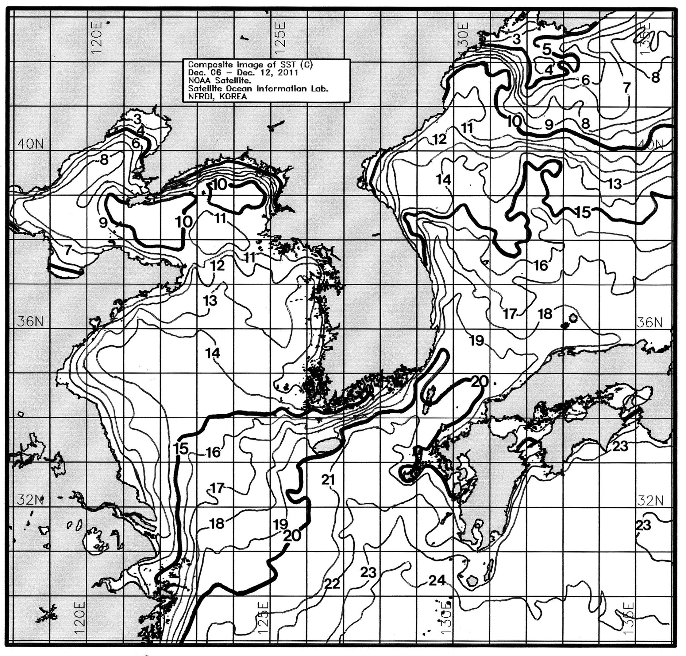 o 금주(2011.12.06~2011.12.12)의 한국근해 표면수온은 대화퇴 근해 12~13도, 울릉도 근해 15~16도, 대마도 근해 20~21도, 제주도 근해 19~20도, 이어도 근해 17~18도, 가거초 근해 15~16도, 어청도 근해 13~14도로 나타납니다. o「평년에 비해」대화퇴 근해 0.5도 높게, 울릉도 근해 0.5도 낮게, 대마도 근해 0.3도 높게, 제주도 근해 비슷하게, 이어도 근해 비슷하게, 가거초 근해 1.2도 높게, 어청도 근해는 1.5도 높게 나타납니다. o「전년에 비해」대화퇴 근해 2.0도 높게, 울릉도 근해 0.5도 높게, 대마도 근해 0.5도 낮게, 제주도 근해 비슷하게, 이어도 근해 1도 높게, 가거초 근해 3도 높게, 어청도 근해는 2도 높게 나타납니다. o 수온 전선대는 우리나라 제주해협에서 대한해협까지 18도를 중심으로 형성됩니다.