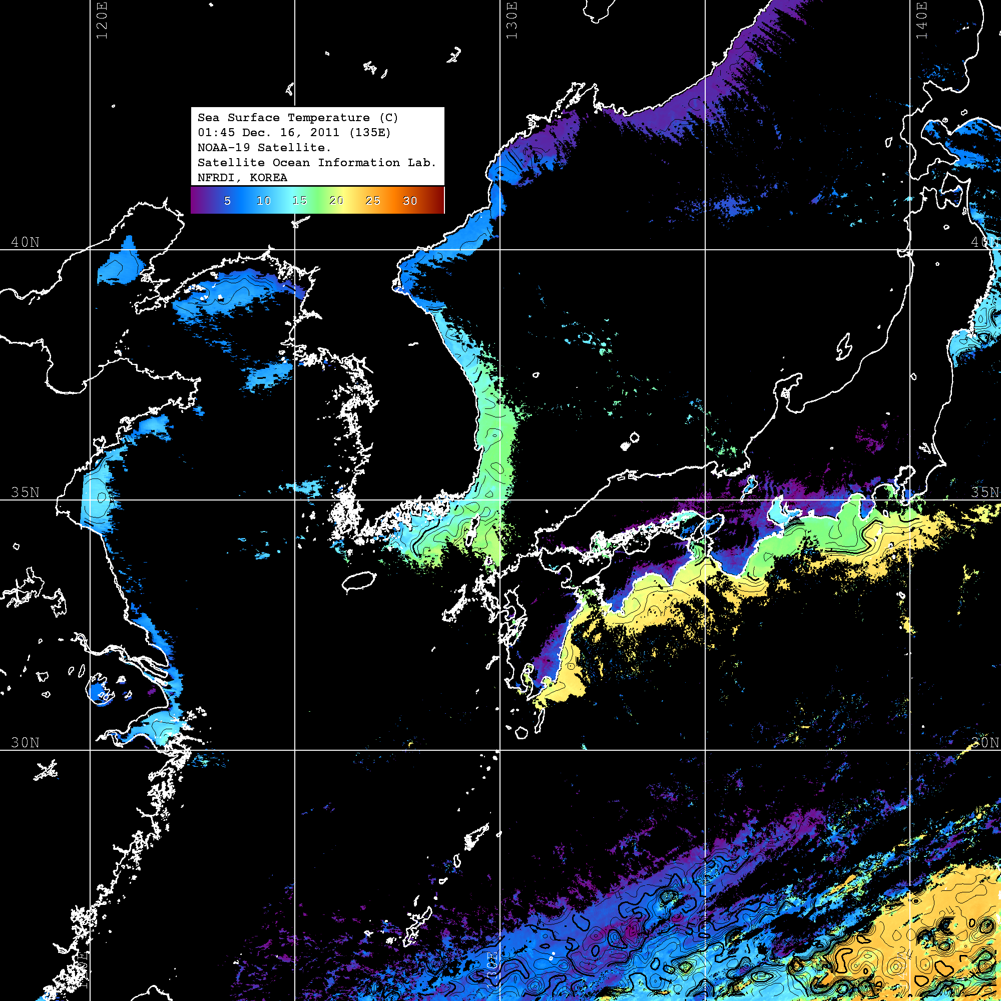 o 2011년 12월 16일 NOAA 위성영상입니다. o 영상 시간 및 수온분포는 범례를 참고하시기 바랍니다. o 검은색은 구름을 나타냅니다. o 그림을 클릭하시면 크게 보실 수 있습니다.