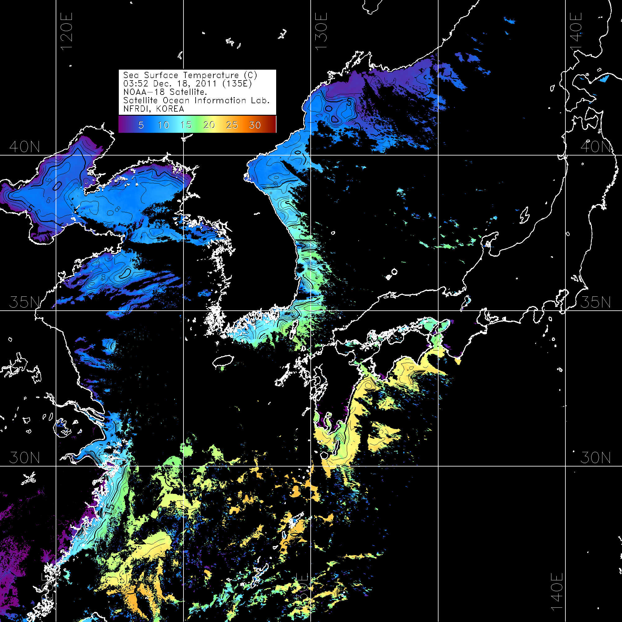 o 2011년 12월 18일 NOAA 위성영상입니다. o 영상 시간 및 수온분포는 범례를 참고하시기 바랍니다. o 검은색은 구름을 나타냅니다. o 그림을 클릭하시면 크게 보실 수 있습니다.