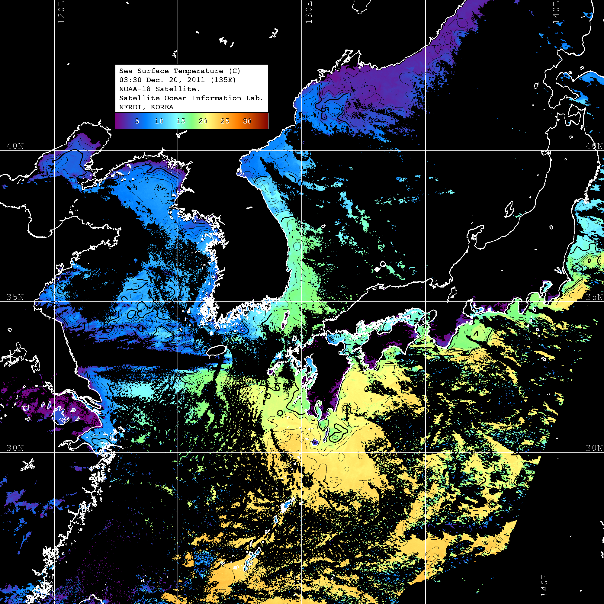 o 2011년 12월 20일 NOAA 위성영상입니다. o 영상 시간 및 수온분포는 범례를 참고하시기 바랍니다. o 검은색은 구름을 나타냅니다. o 그림을 클릭하시면 크게 보실 수 있습니다.