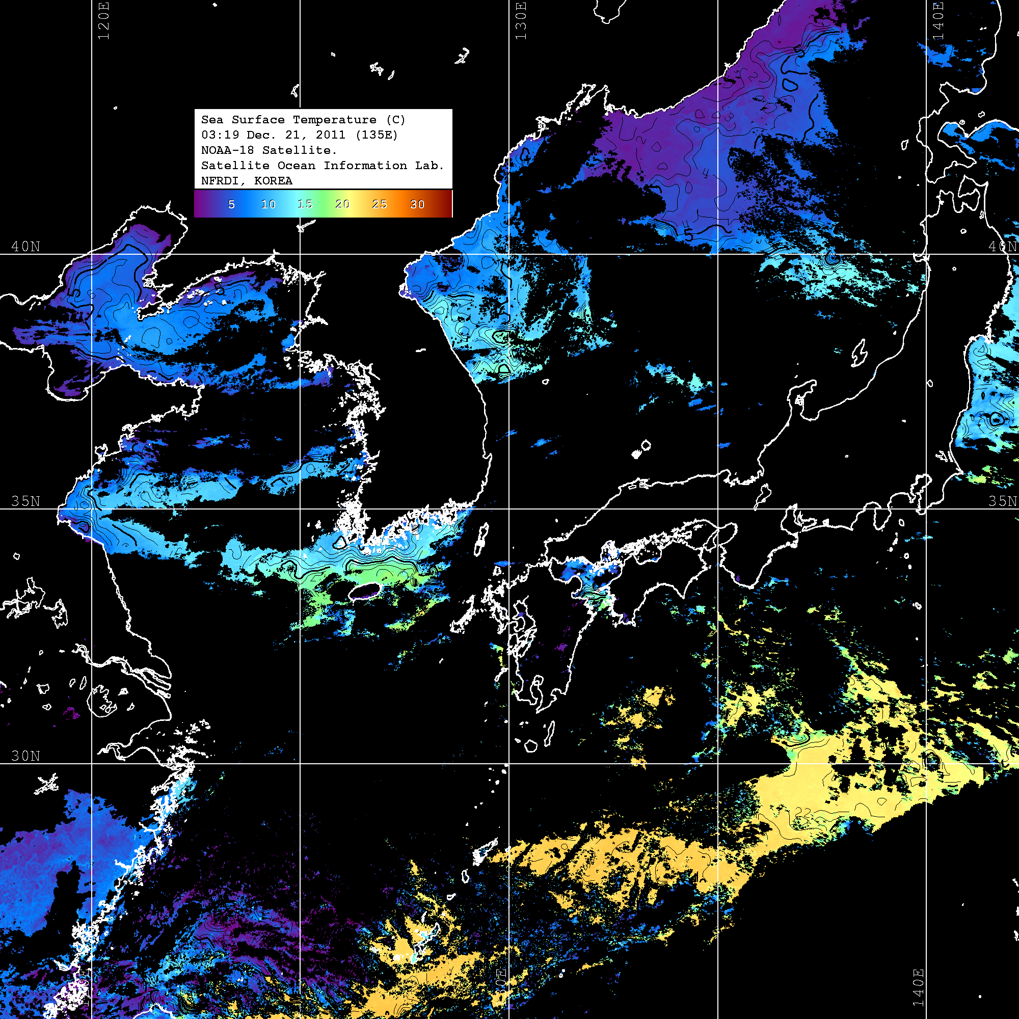 o 2011년 12월 21일 NOAA 위성영상입니다. o 영상 시간 및 수온분포는 범례를 참고하시기 바랍니다. o 검은색은 구름을 나타냅니다. o 그림을 클릭하시면 크게 보실 수 있습니다.