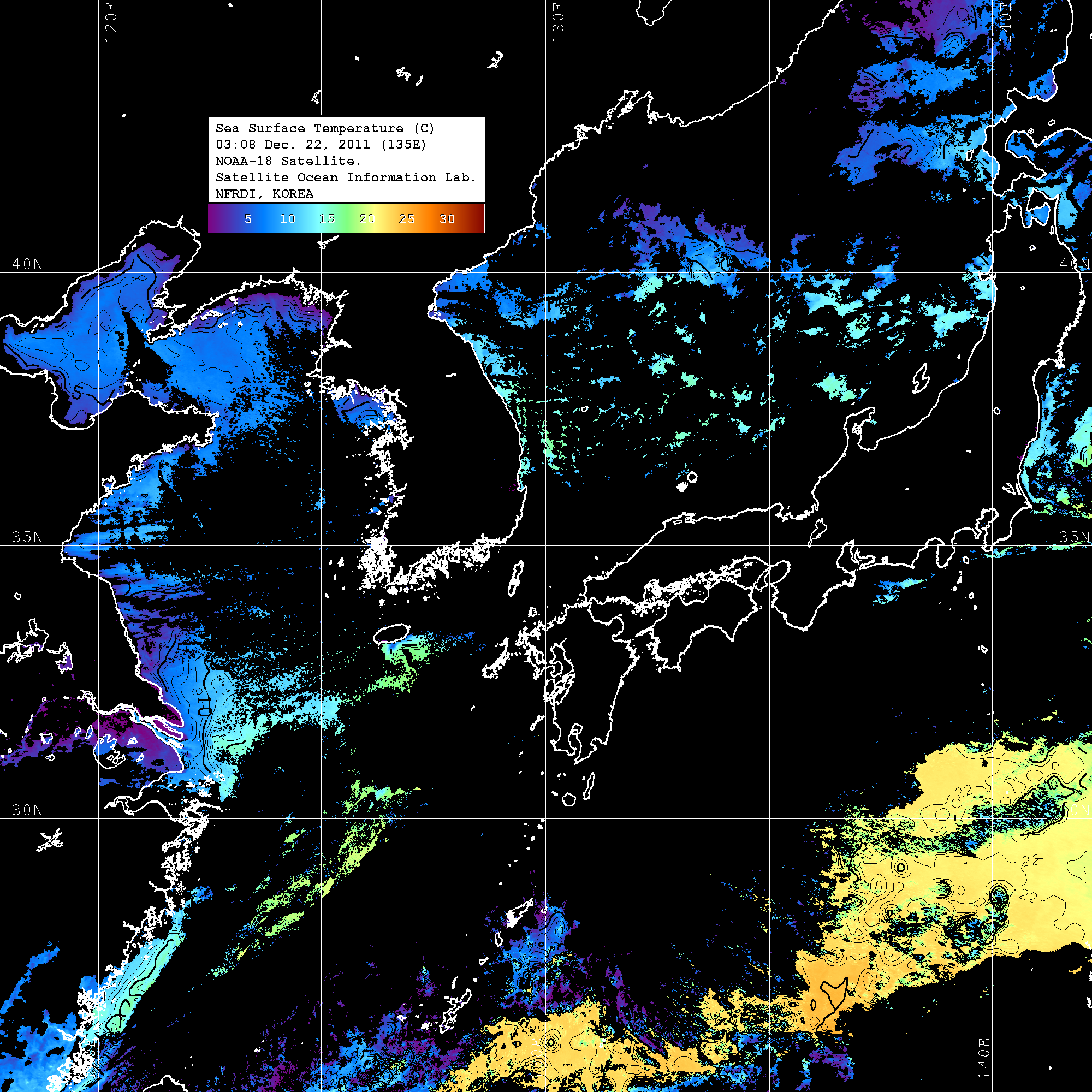 o 2011년 12월 22일 NOAA 위성영상입니다. o 영상 시간 및 수온분포는 범례를 참고하시기 바랍니다. o 검은색은 구름을 나타냅니다. o 그림을 클릭하시면 크게 보실 수 있습니다.