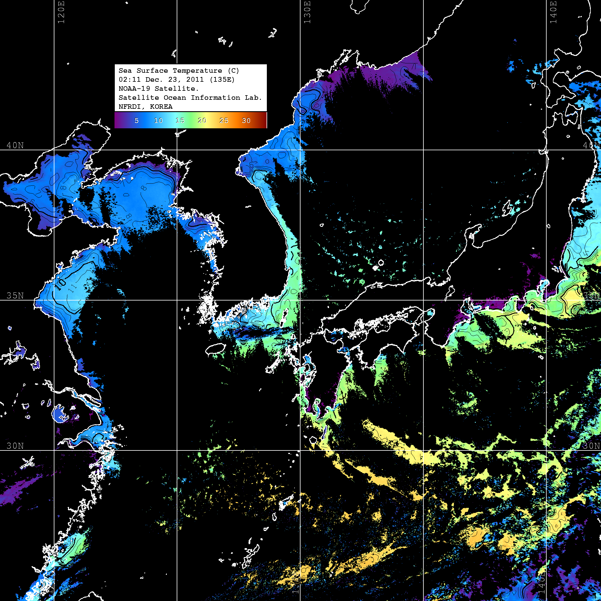 o 2011년 12월 23일 NOAA 위성영상입니다. o 영상 시간 및 수온분포는 범례를 참고하시기 바랍니다. o 검은색은 구름을 나타냅니다. o 그림을 클릭하시면 크게 보실 수 있습니다.
